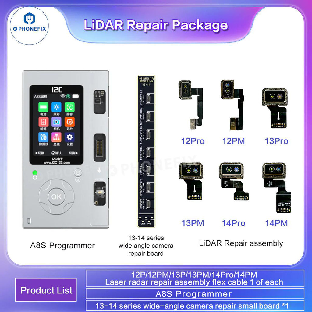 i2C Laser LiDAR Radar FPC Flex Cable For iPhone 12 Pro-14 Pro Max, solves iPhone rear camera VR measurement and disable rangefinder issues. i2C A8S programmer with i2C wide angle camera repair board and Laser LiDAR Repair FPC Cable/Chip for iPhone 12-14 series LiDAR repair. Professional iPhone repair kit.