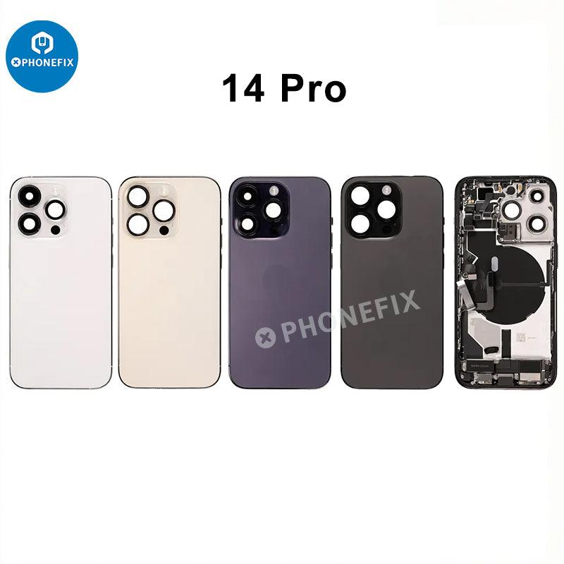 iPhone 14 Pro/14 Pro Max rear housing full assembly: Purple, Gold, Silver, Black.