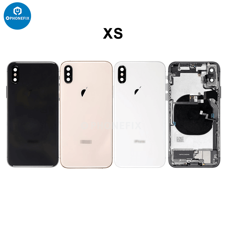 iPhone XS rear housing full assembly: Gold, Space Gray and Silver Finishes.