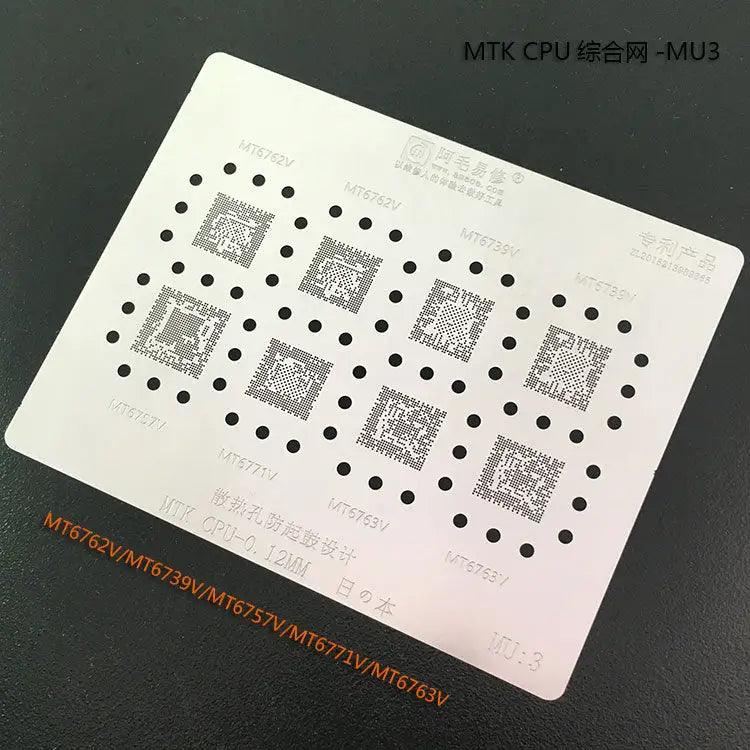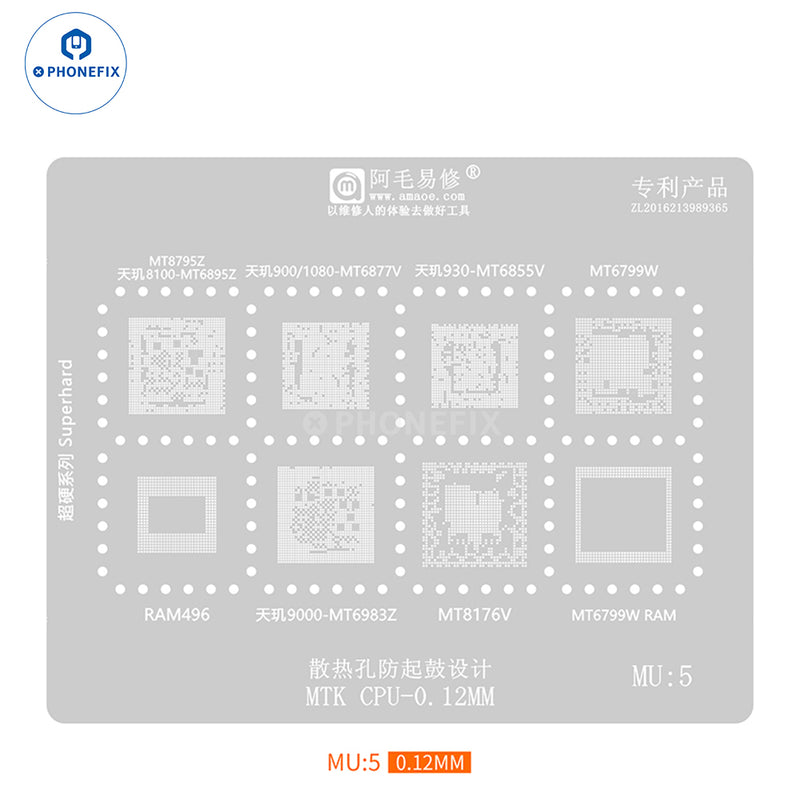 AMAOE BGA reballing stencil MTK CPU MU:1 MU:2 MU:3 MU:4 MU:5 Template for MTK CPU MU1/MU2/MU3/MU4/MU5. High Quality BGA Reballing Stencil For MTK CPU 6885Z MT6853V 6769V 6779V 6891Z 6758V 6768V RAM MT6885Z, MT8795Z, Dimensity 8100-MT6895Z, Dimensity 900/1080-MT6877V, Dimensity 930-MT6855V, MT6799W, RAM496, Dimensity 9000-MT6983Z, MT8176V, MT6799W RAM Steel mesh.