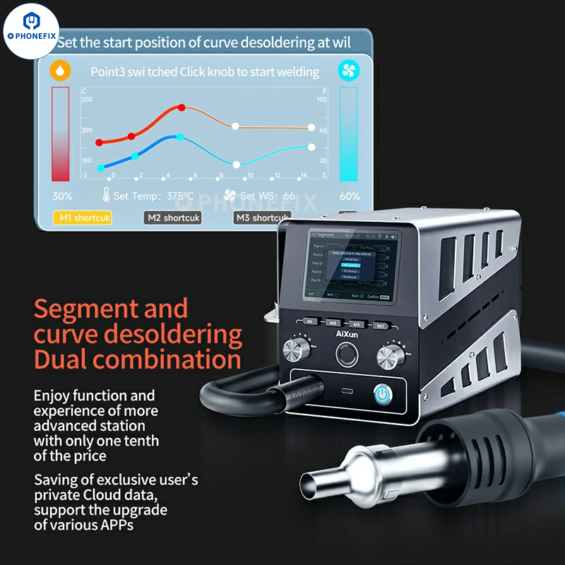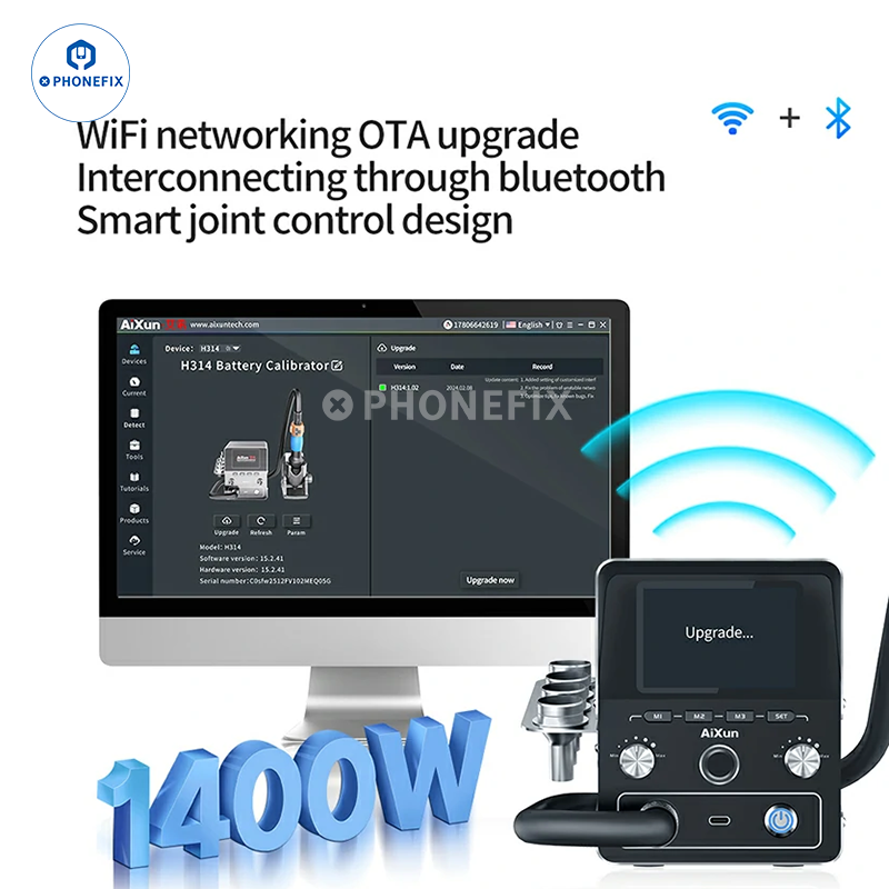 AiXun H314 1400W Smart Hot Air Gun Heating Intelligent Rework Station For Mobile Phone Tablets SMD BGA Repair. Aixun H314 intelligent digital hot air gun desoldering station has a rated power of 1400W, heat up to 380°C in 3 seconds, WiFi networking OTA upgrade, and supports AI intelligent voice central control to improve maintenance efficiency.