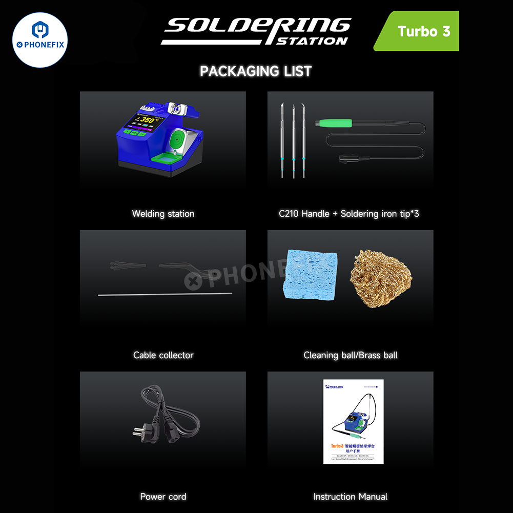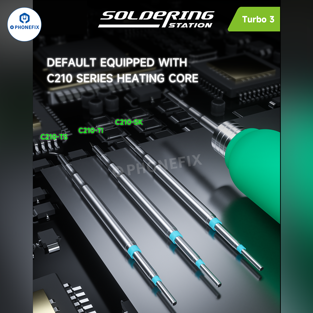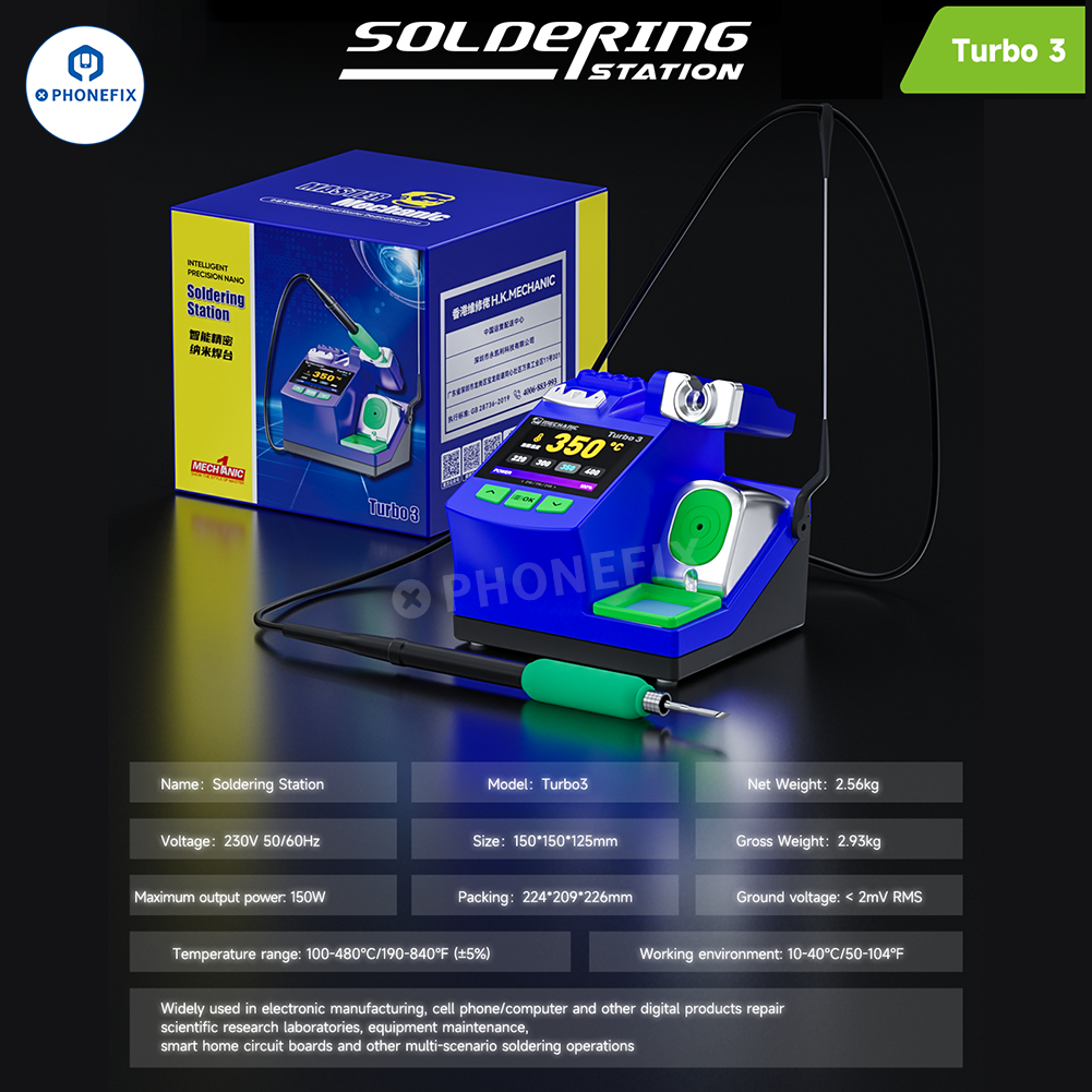Mechanic Turbo 3 Precision Nano Soldering Station supports C210 C245 C115 Iron Tips for Mobile Phone Welding Repair. Mechanic Turbo 3 150W soldering station with C210 I/S/SK soldering tips, intelligent sleep mode, four memory gears. Rapid heating in 2S, quick tin melting in 3S, improving the efficiency of BGA soldering and maintenance on electronic motherboards.