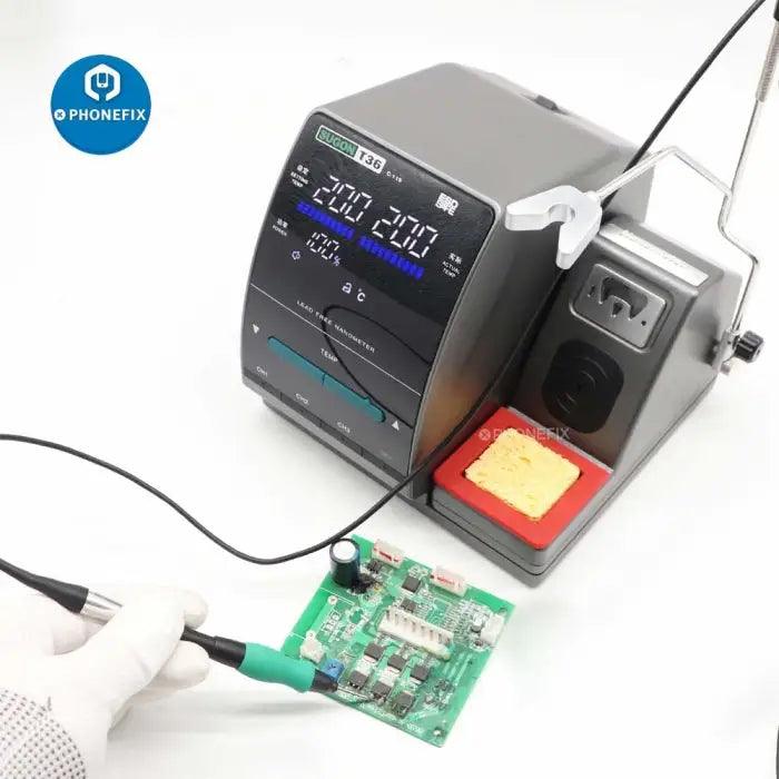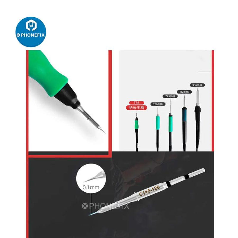 SUGON T36 Nano Soldering Station With JBC C115 Soldering Iron Tips 1S Rapid Heating SMD BGA Rework Station. Sugon T36 soldering station with T115 welding handle and C115 series iron tips For mobile phone tablets electronic integrated circuit board CPU BGA SMD chip soldering desoldering repair.