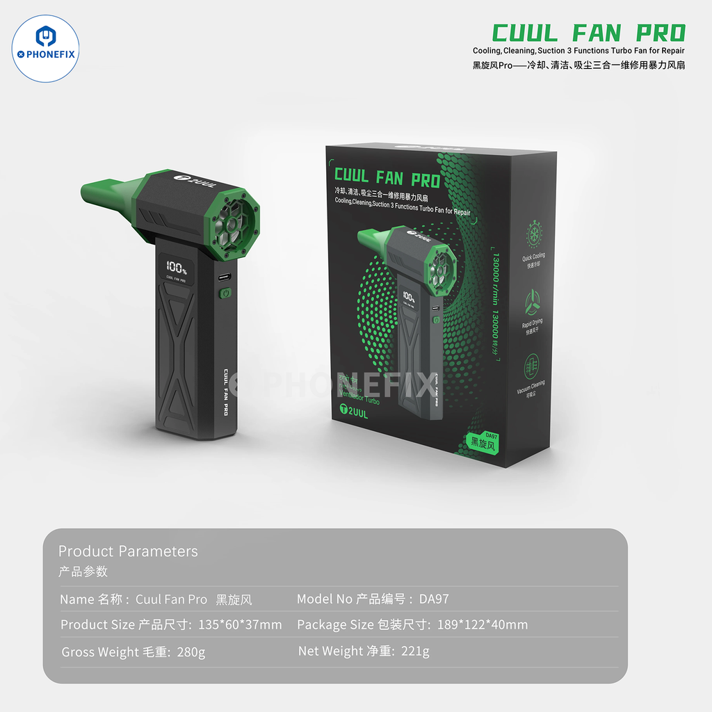 2UUL DA97 DA970 Cuul Fan Pro Turbo Fan with Cooling Cleaning Suction for Mobile Phone Repair. Its rapid cooling/drying and vacuum cleaning functions are ideal for cooling and removing dust and debris during mobile phone CPU CHIPS and motherboard repairs.