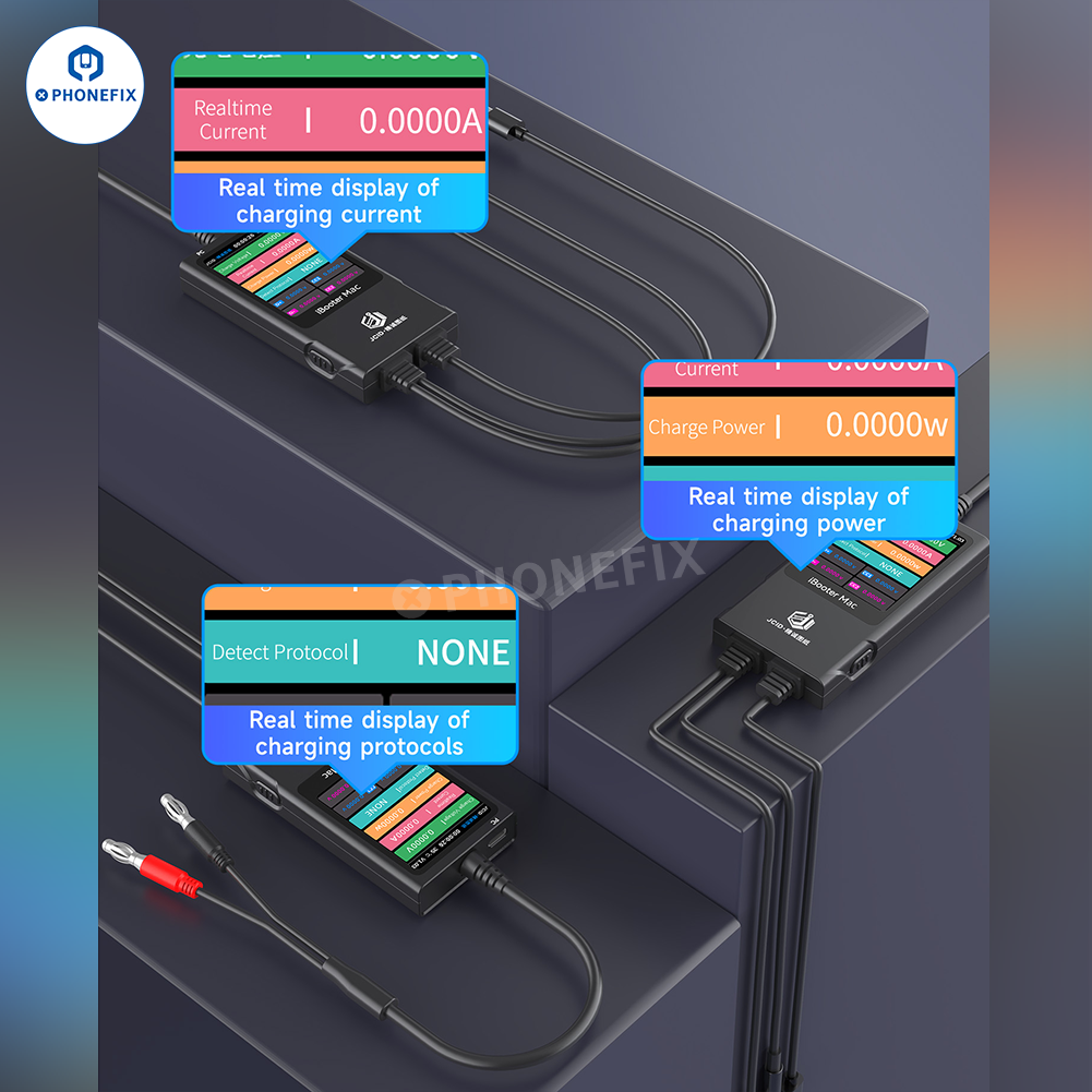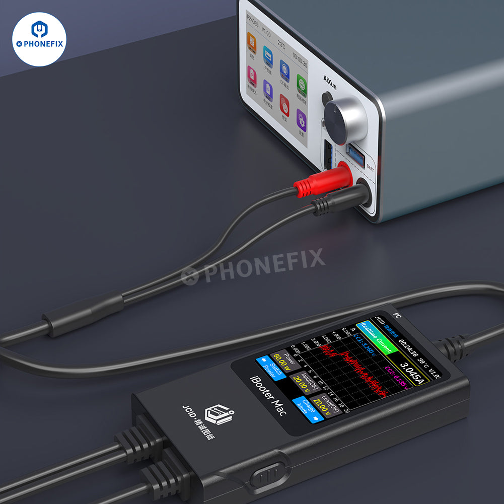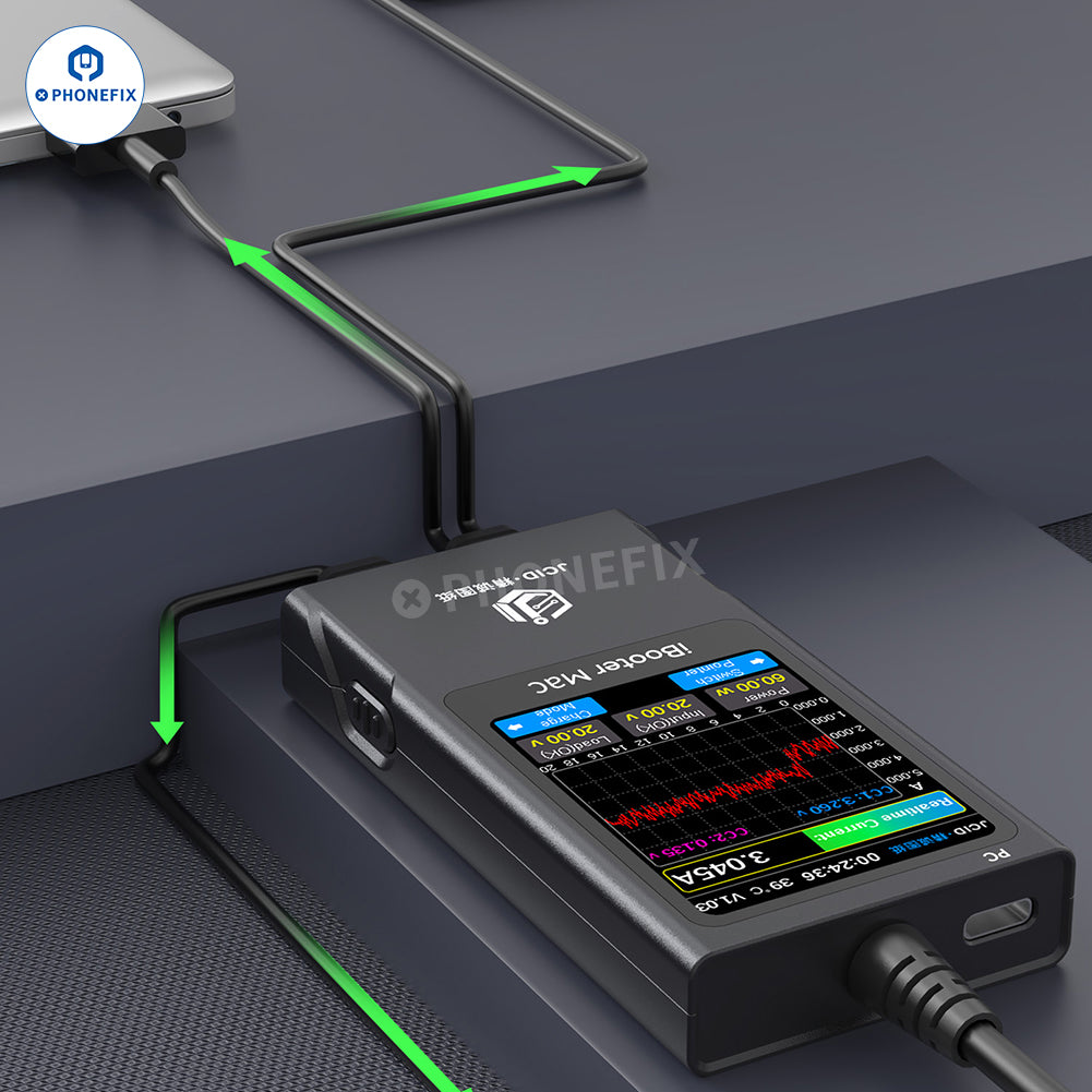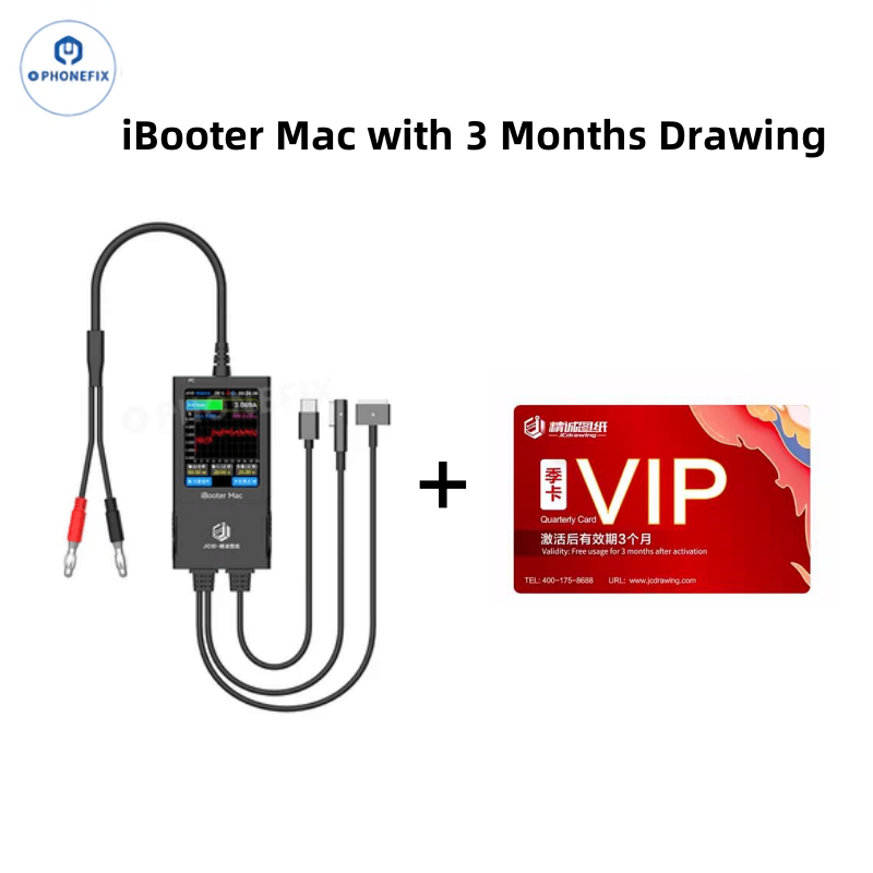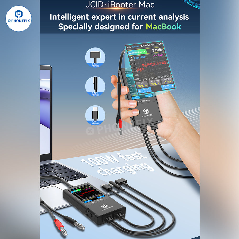 JCID iBooter Mac Current Analyzer with MagSafe cable (L-tip, T-tip and USB-C) for MacBook charging detection, used with the JCID Drawing, can locate and detect MacBook charging faults, power-on current detection and analysis, PD/QC/FCP/SFCP charging protocols detection. Real-time display of current curve and voltage monitoring, digital and curve display, one-key pause and data analysis.