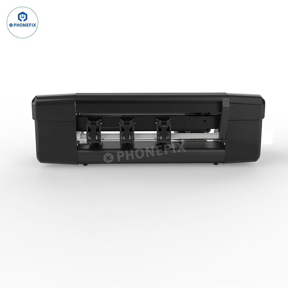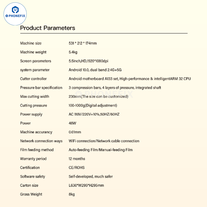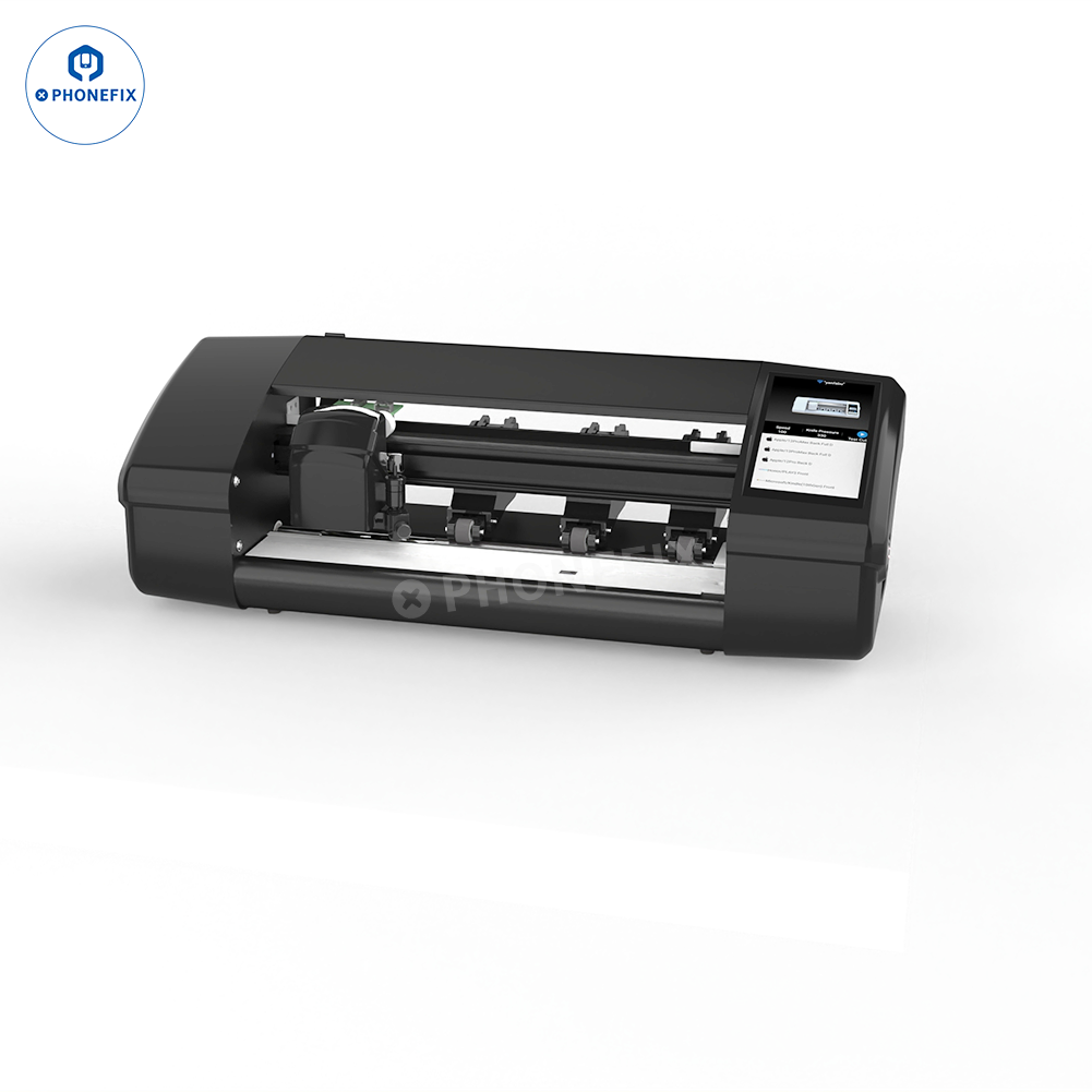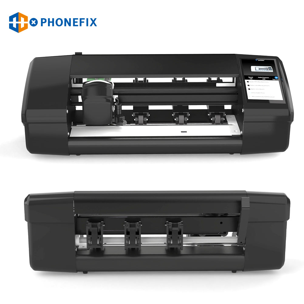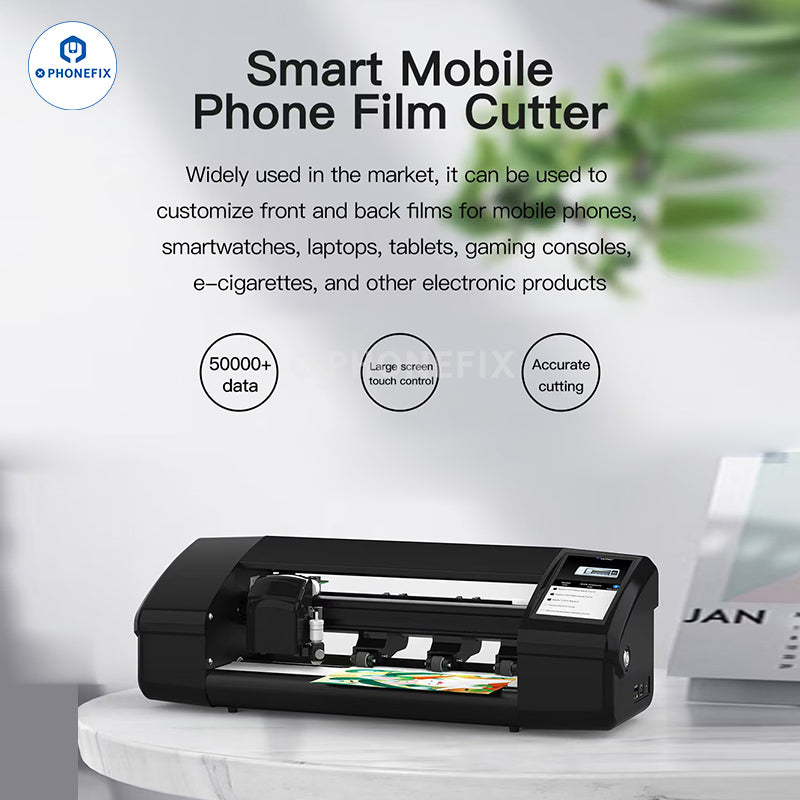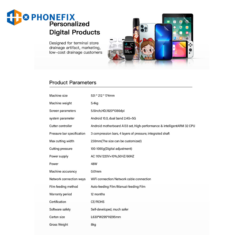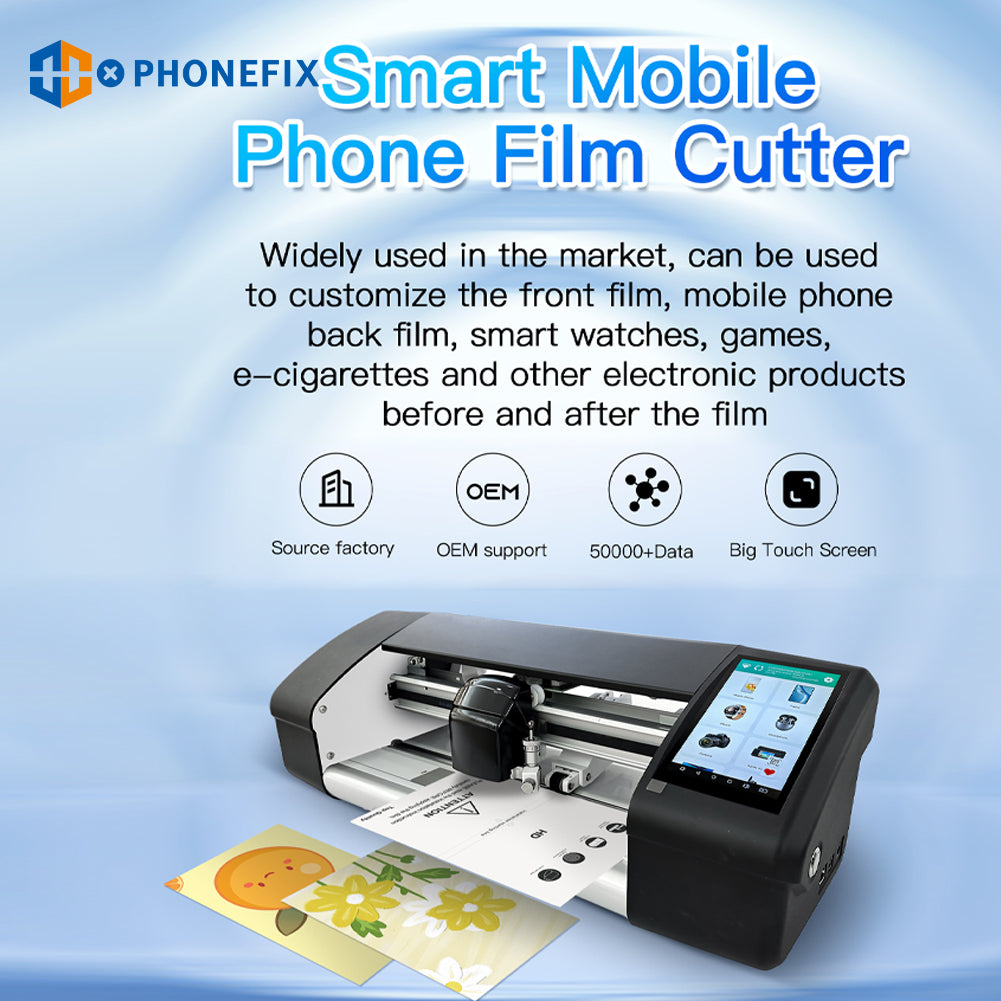 PHONEFIX X9 intelligent unlimited film cutting machine supports DIY cutting of hydrogel film screen protectors for iPhone/mobile phones/iPads/tablets/smart watches/gaming consoles below 12.9 inches. Phonefix X9 smart film cutter with large touch screen, WIFI connection, manual/auto-feeding film, accurate cutting front/back film for protecting phone screen and back cover glass.