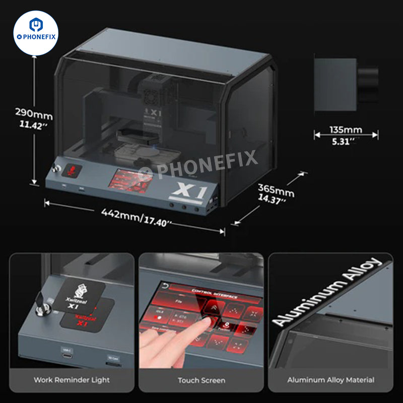 Xwitzeal X1 20W Laser Machine has iPhone 8-16 Pro Max back glass removal, laser engraving, UV curing, and mobile phone screen film cutting 4-in-1 function. Powerful multi-function laser machine for iPhone/mobile phone repair, DIY logo laser marking, unlimited film cutting, UV glue curing, phone surface disinfection. ect.