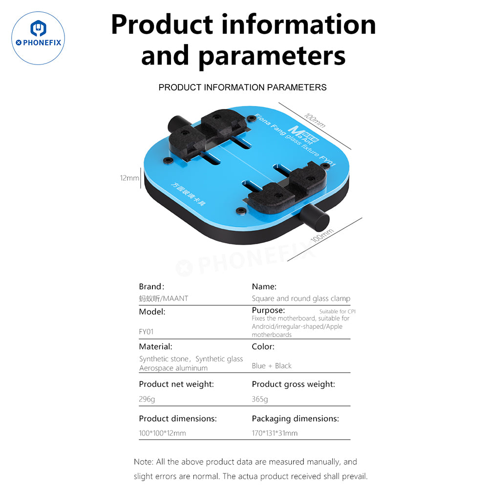 MaAnt FY01 square glass clamp and MaAnt M085 tempered insulating glass clamp are used to fix mobile phone motherboard CPU Nand chip, making mobile phone motherboard chip soldering and repair efficient and convenient. High temperature resistant, fast heat dissipation, smooth insulating glass panel, corrosion resistant, stable clamping.