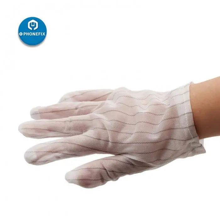 - Made of breathable polyester material, these White Anti Static Gloves are work continuously, discharging static harmlessly.