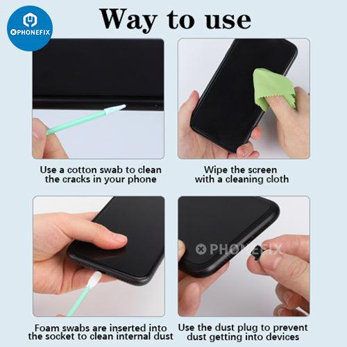 Way to use: Clean the surface dust of the phone with the nylon brush, then wipe the screen with a cleaning cloth, use the foam swab stick insert to the appropriate phone jack to clean the inner dust, and then you can use the dust plug to prevent dust and dirt from getting into your devices