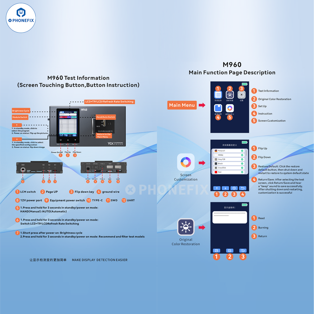 YCX M9 & YCX M960 Intelligent Screen Tester for testing iPhone 6-17 Pro Max displays, Samsung, Huawei, Xiaomi, OPPO, VIVO, Motorola, Transsion, Sharp AQUOS, and iPad. YCX M960/M9 LCD screen tester supports real-time screen recognition, screen True Tone burn-in, refresh rate testing, display touch function testing, automatic program version loading, and 32GB of EMMC storage. It uses various display test cables and supports screen testing on most phone models.