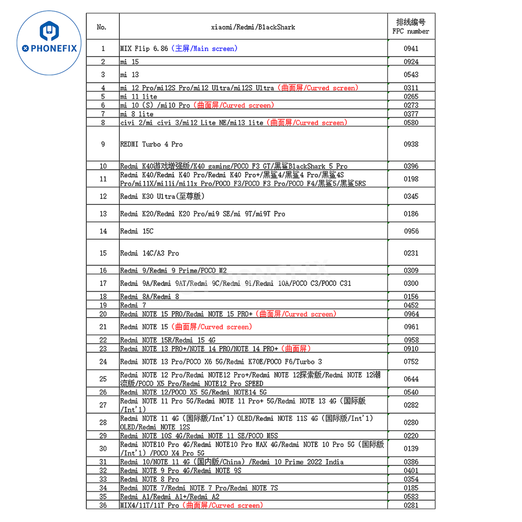 6. Xiaomi/Redmi/BlackShark screen test flex (36pcs).