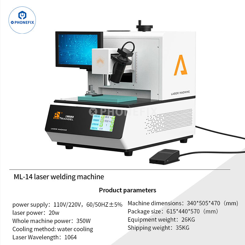 M-TRIANGEL ML-14 battery laser spot welding machine for iPhone battery repair replacement. M-Triangel ML-14 water-cooled spot welding machine with advanced laser spot welding technology and customizable parameters provides unparalleled precision and efficiency for mobile phone battery welding operations.