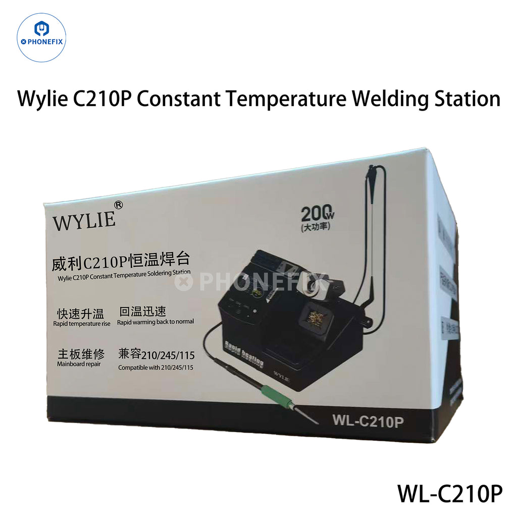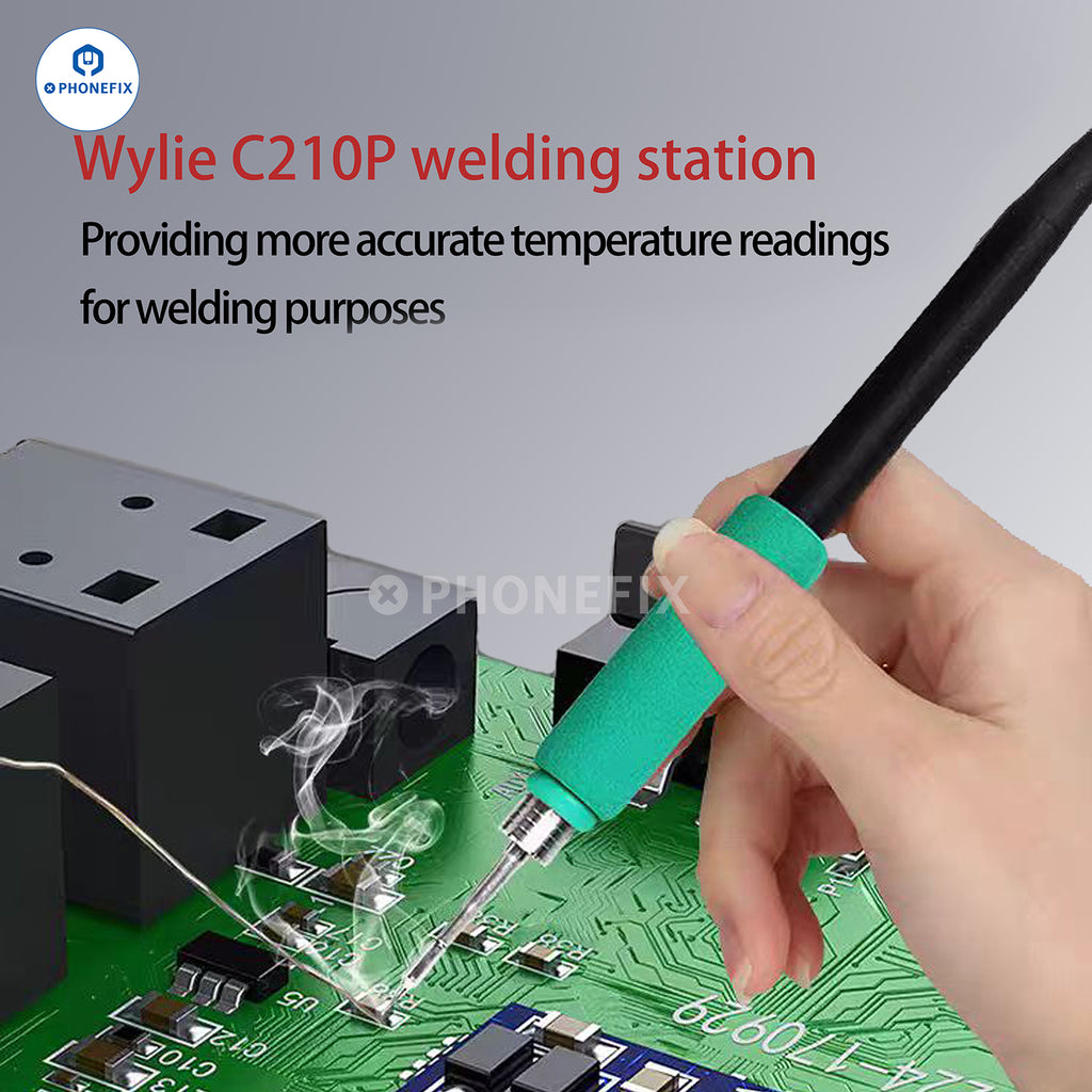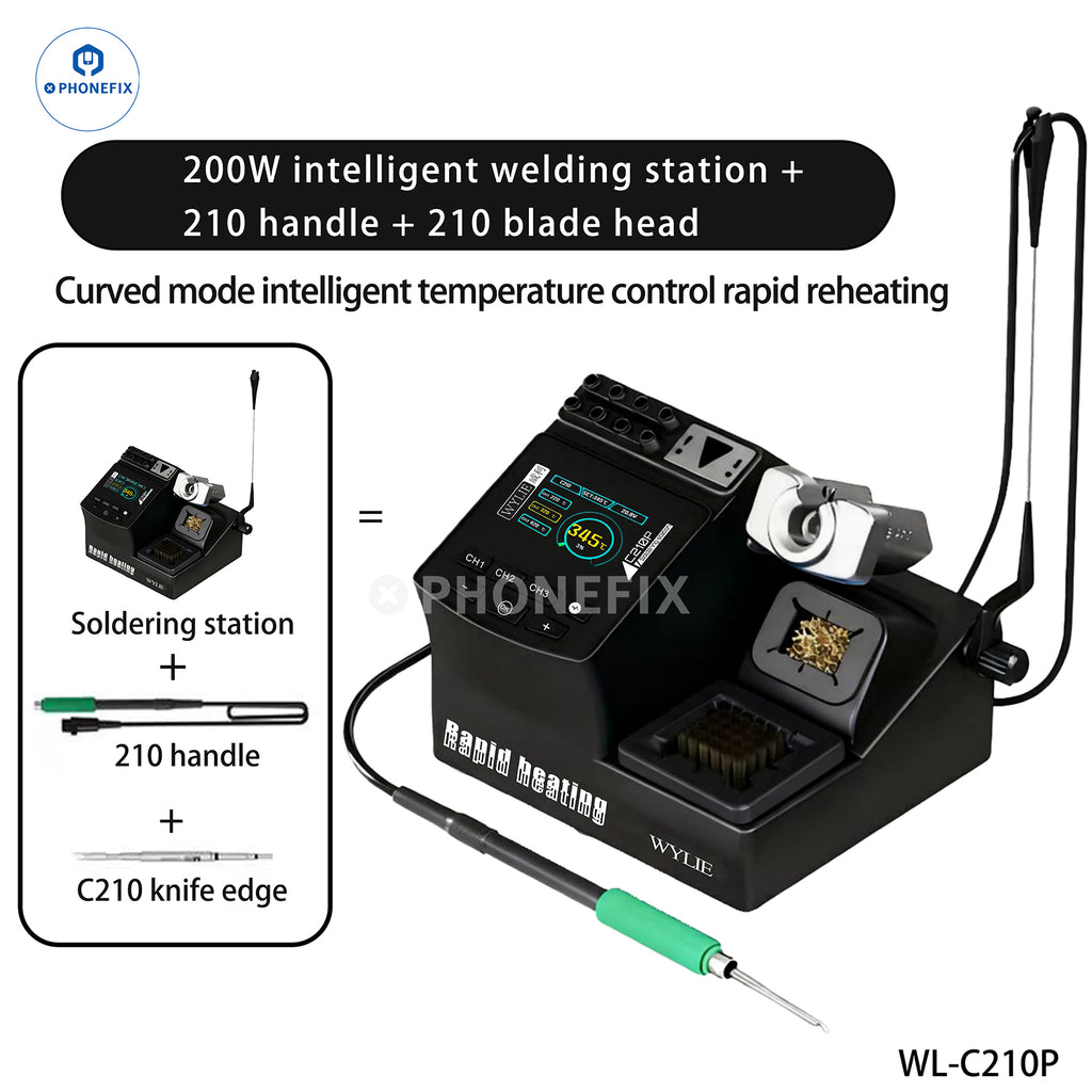 WYLIE C210P Intelligent Temperature-Controlled Soldering Station is compatible with 210/245/115 handles and soldering tips for mobile phone repair. 200W high power, 60℃ to 480℃ adjustable, rapid heating and cooling, automatic sleep mode. Suitable for mobile phone repair, laptop repair, soldering and repair of electronic circuit boards, PCBs, CPUs, BGA chips, etc.