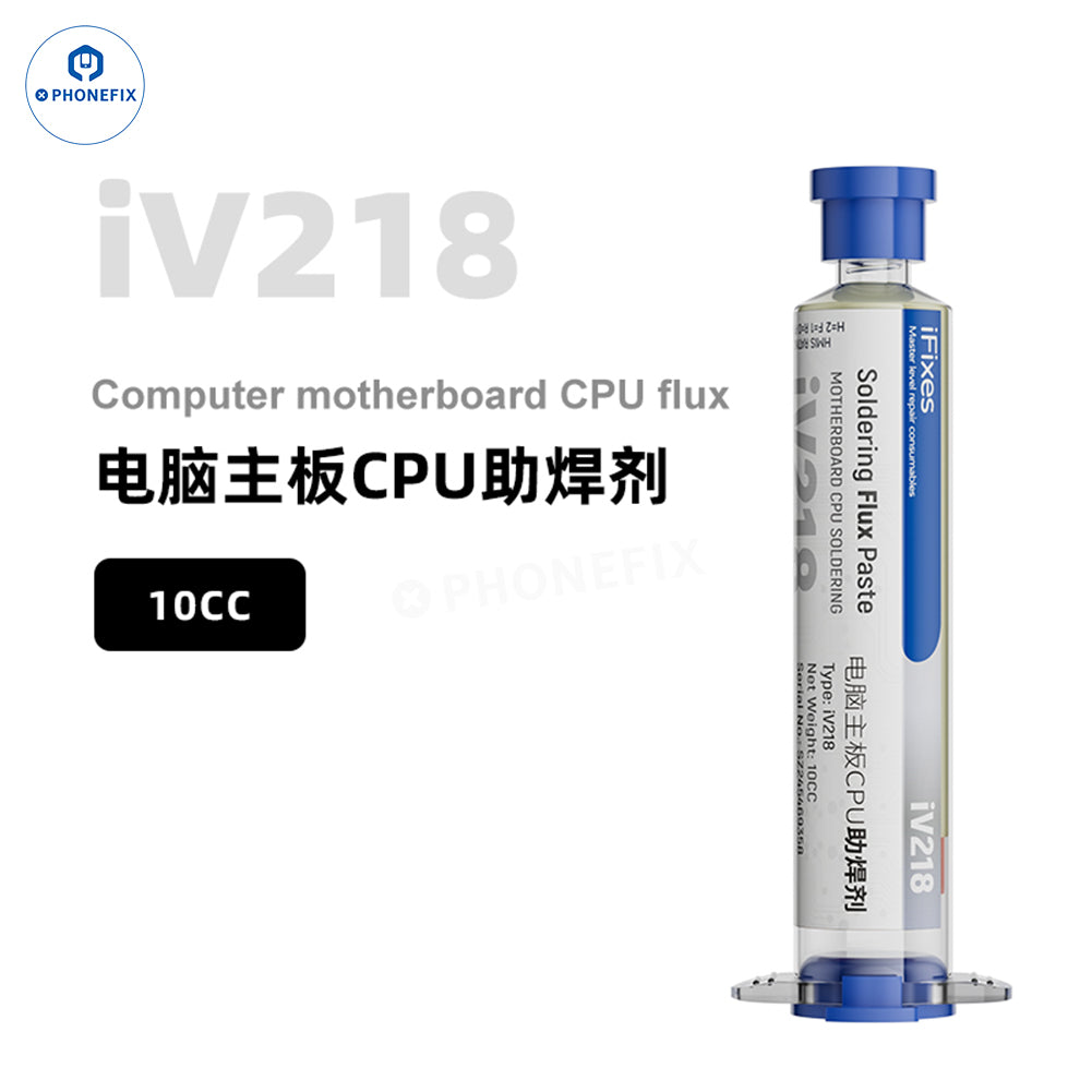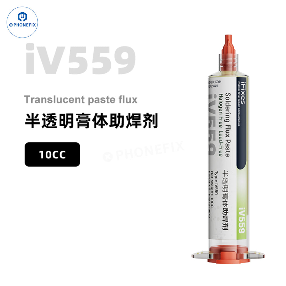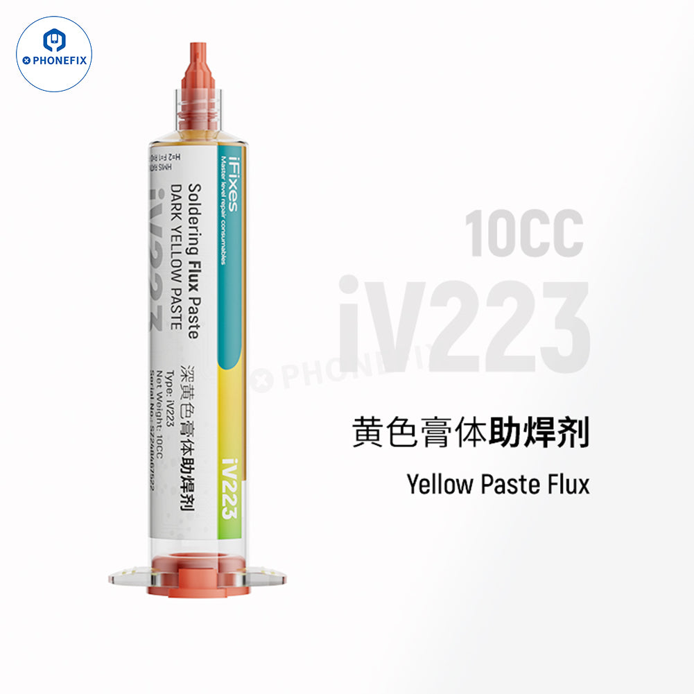 iFixes 10CC translucent/fully transparent/milky white/light yellow lead-free soldering flux paste for mobile phone Motherboard CPU BGA repair. iFixes Solder Flux syringe injection solder paste welding paste phone finishing soldering consumables series, suitable for Circuit Boards nano chips, mobile phone PCB,SMT repair, electronic components, BGA chip ball soldering.