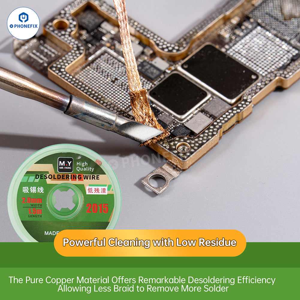 YCS Desoldering Wire 2015 2023 3520 2.0mm 3.5mm width PCB BGA Tin Sucking Wire for Mobile Phone Motherboard Soldering Cleaning Repair. YCS MR. Yang M.Y 2015/2020 Desoldering Wick 2.0mm width PCB BGA Tin Sucking Wire for Mobile Phone repair. YCS original desoldering soldering wire, sood thermal conductivity, strong tin absorption, and no residue.