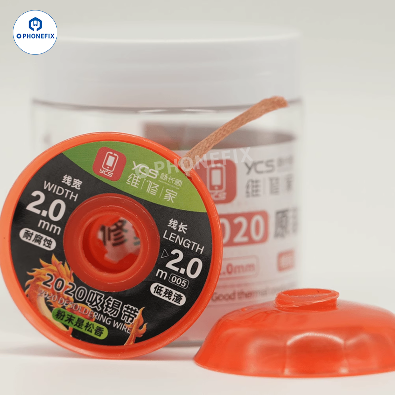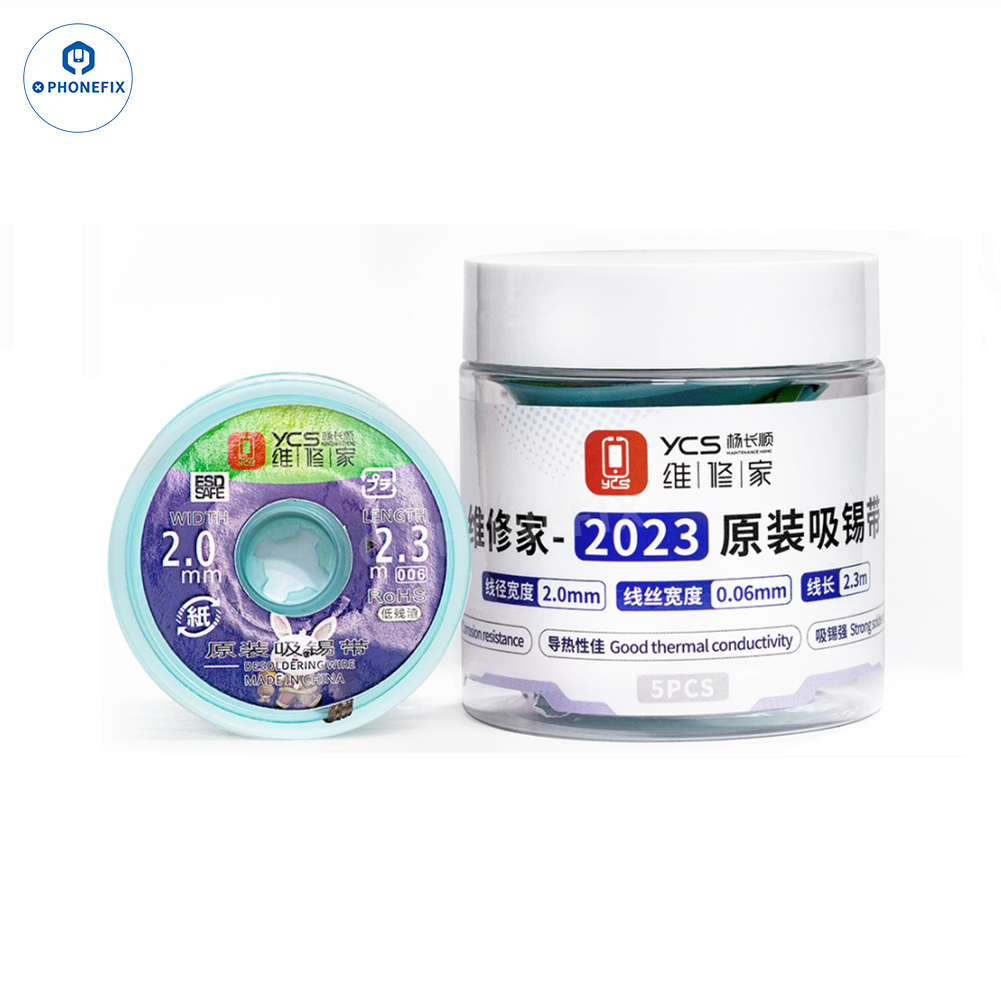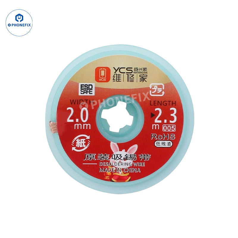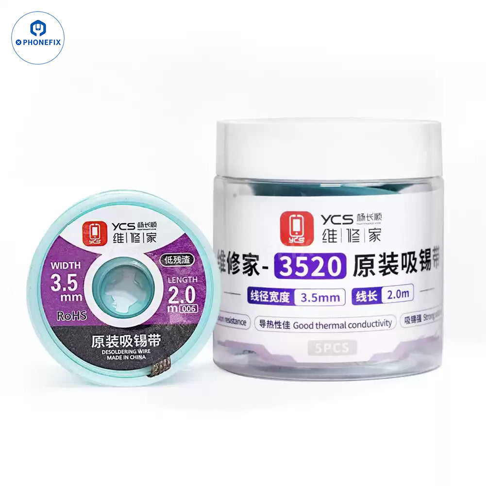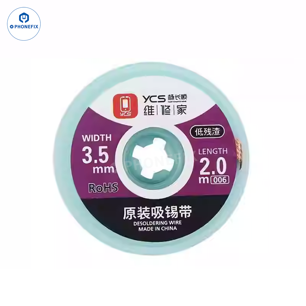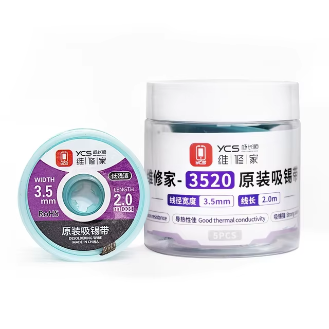 YCS Desoldering Wire 2015 2023 3520 2.0mm 3.5mm width PCB BGA Tin Sucking Wire for Mobile Phone Motherboard Soldering Cleaning Repair. YCS MR. Yang M.Y 2015/2020 Desoldering Wick 2.0mm width PCB BGA Tin Sucking Wire for Mobile Phone repair. YCS original desoldering soldering wire, sood thermal conductivity, strong tin absorption, and no residue.