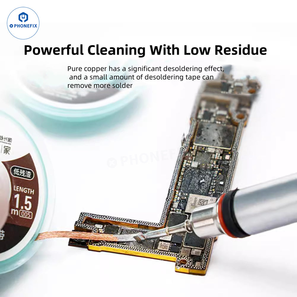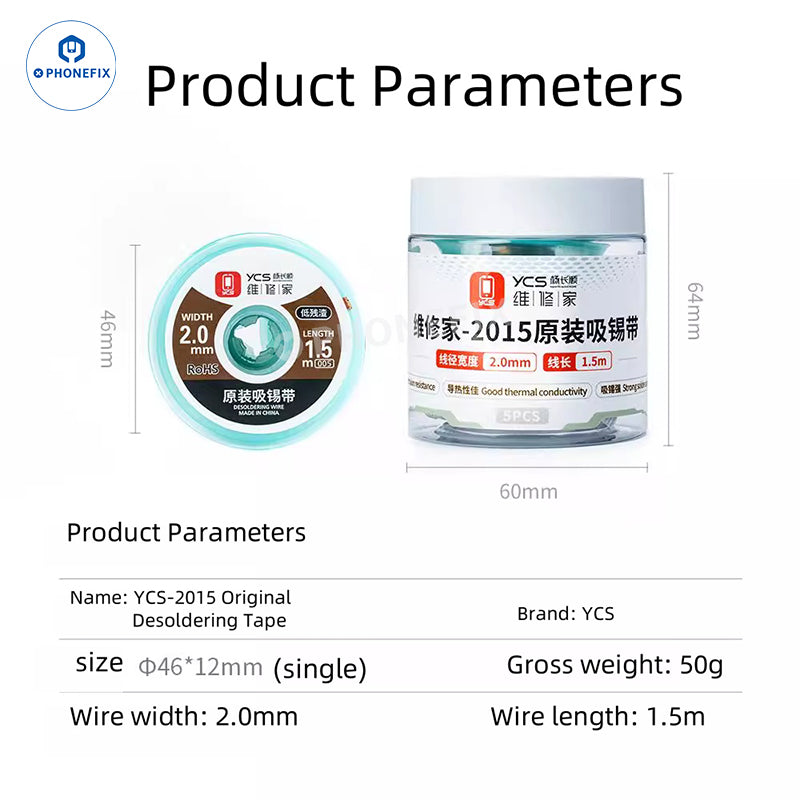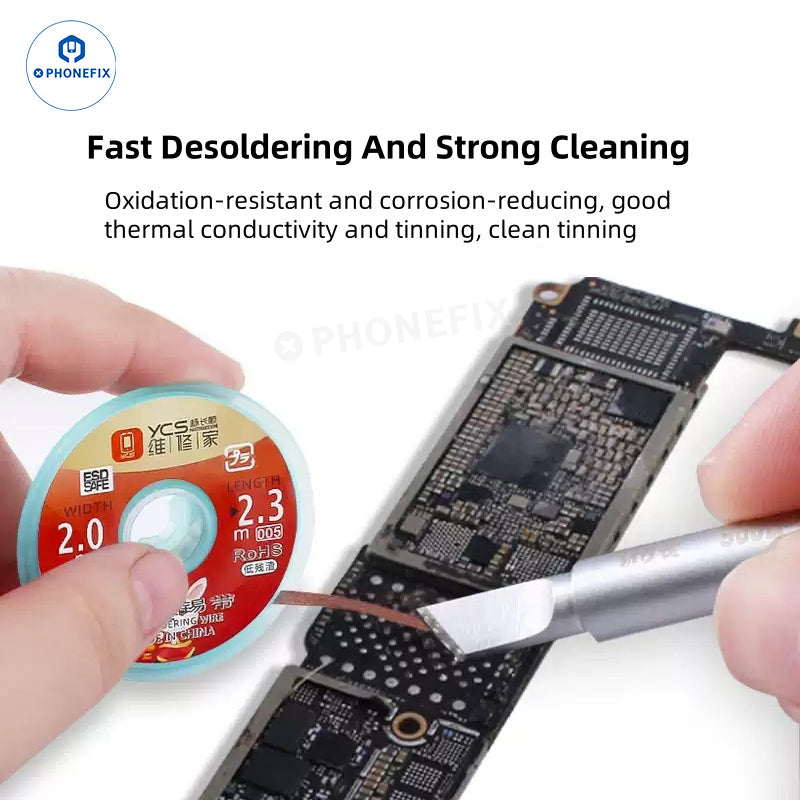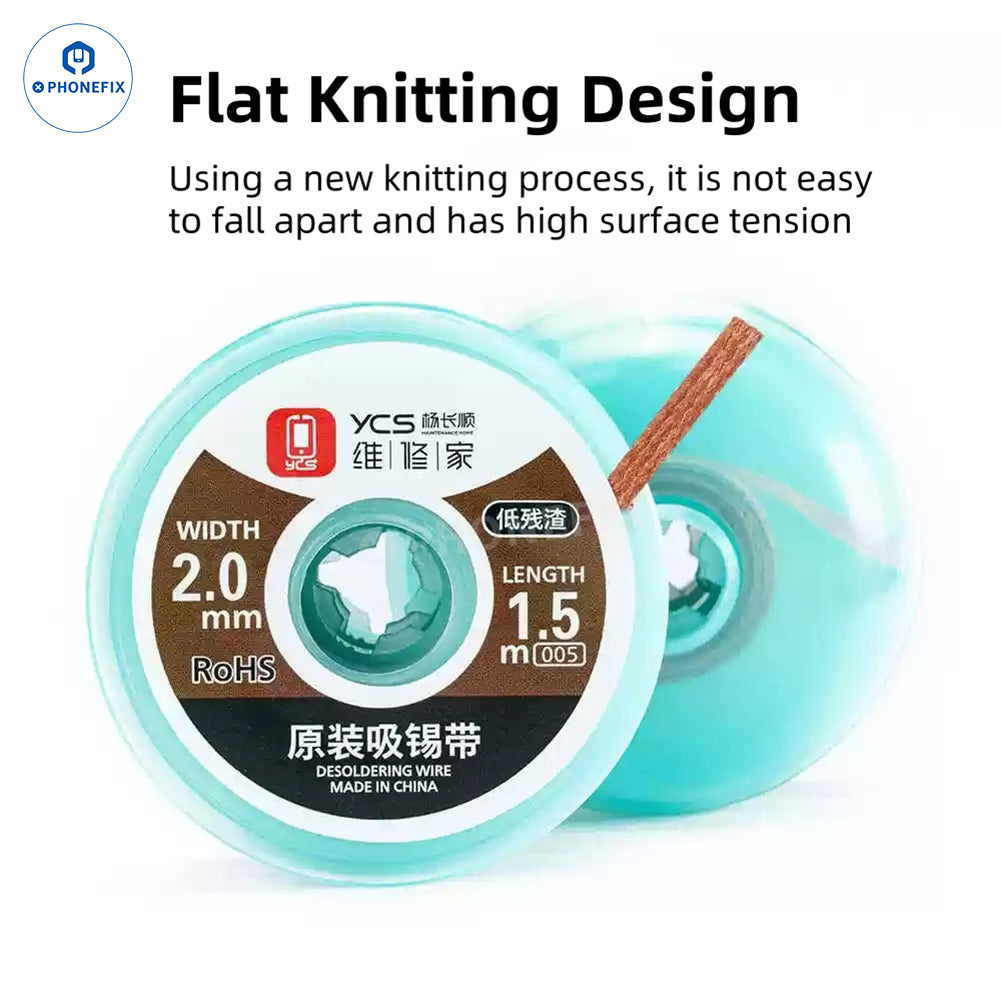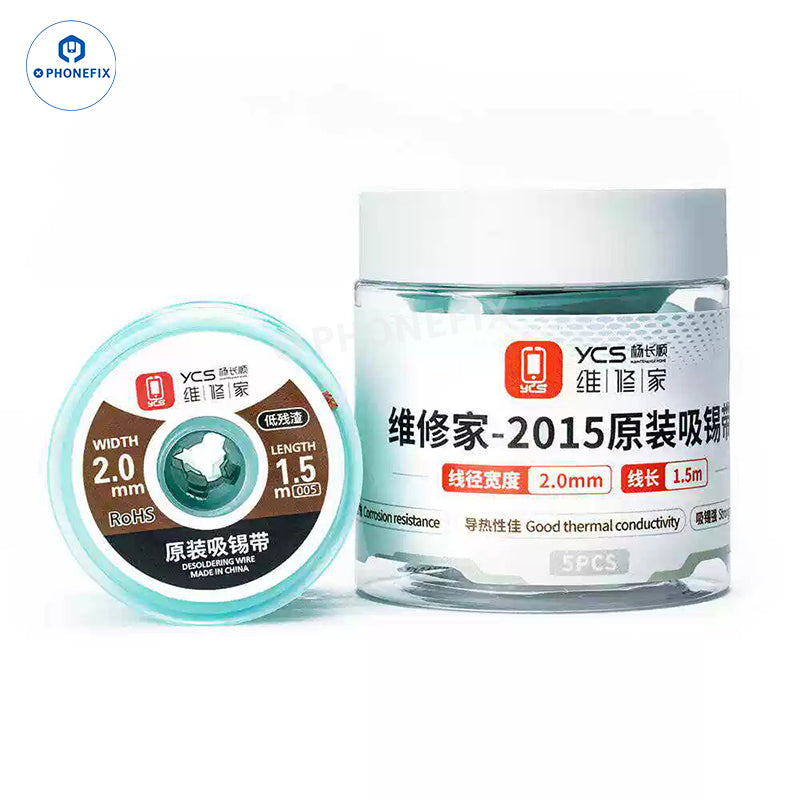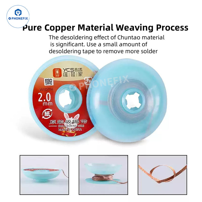 YCS Desoldering Wire 2015 2023 3520 2.0mm 3.5mm width PCB BGA Tin Sucking Wire for Mobile Phone Motherboard Soldering Cleaning Repair. YCS MR. Yang M.Y 2015/2020 Desoldering Wick 2.0mm width PCB BGA Tin Sucking Wire for Mobile Phone repair. YCS original desoldering soldering wire, sood thermal conductivity, strong tin absorption, and no residue.