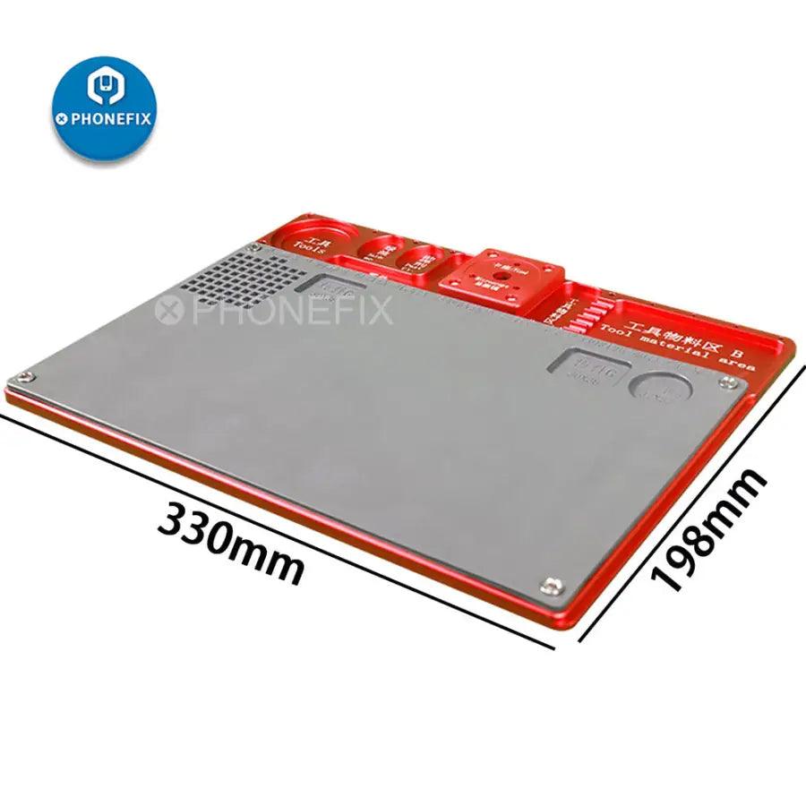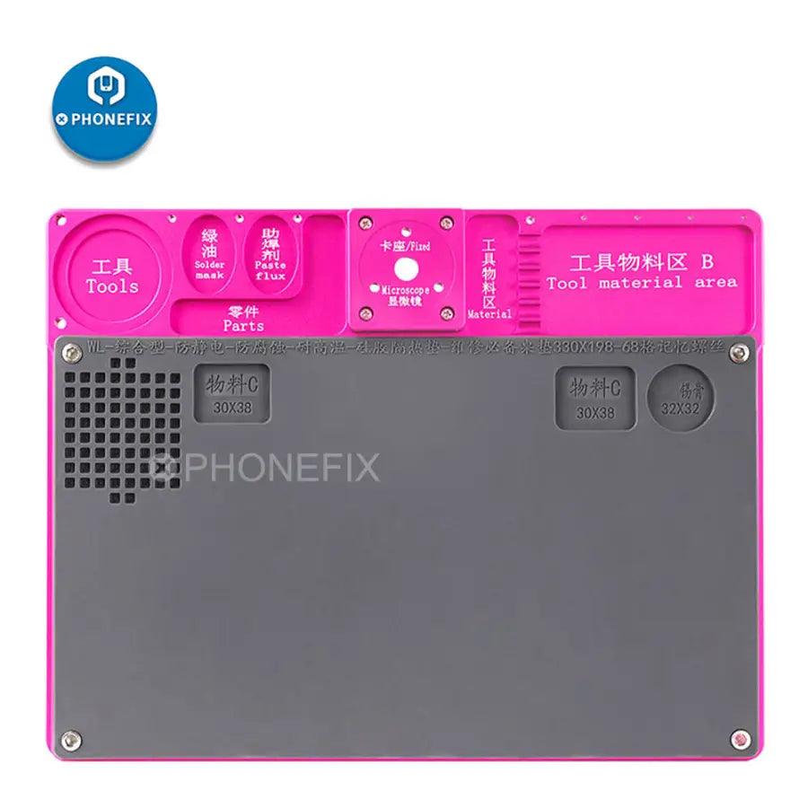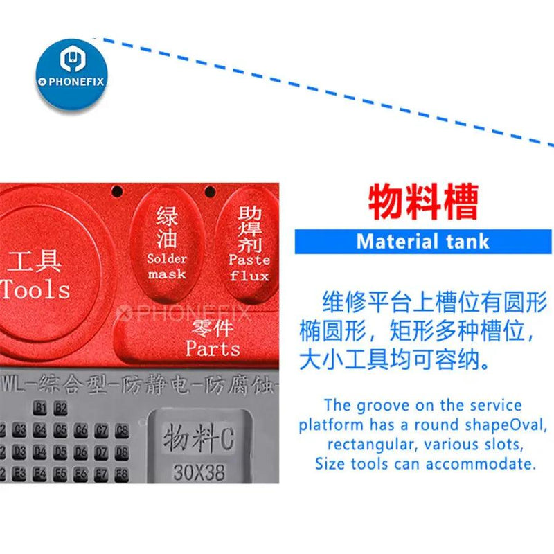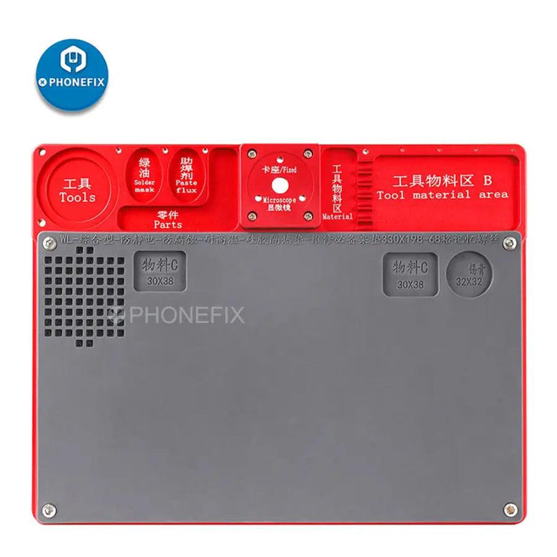 WL multifuctional integrated aluminum alloy microscope maintenance platform with heat insulation silicone insulation pad for cell phone logic board repair, WL heat-resistant phone soldering repair mat platform for mobile phone soldering maintenance.