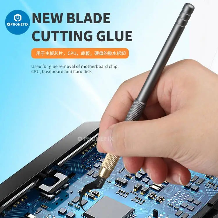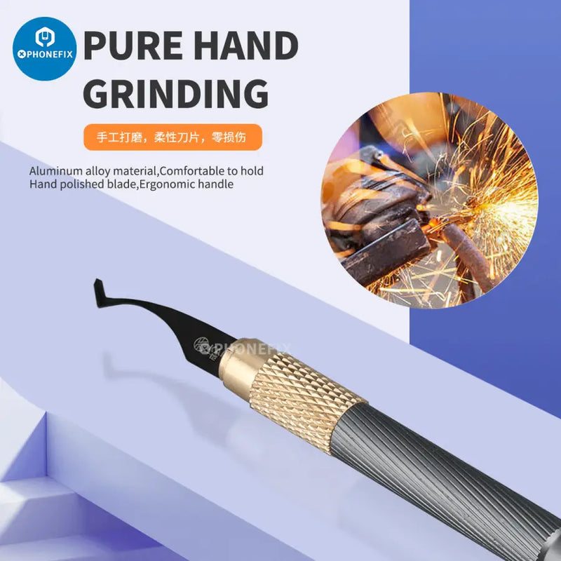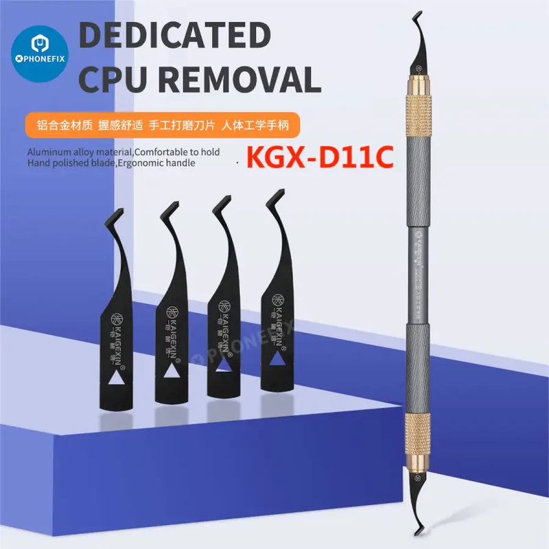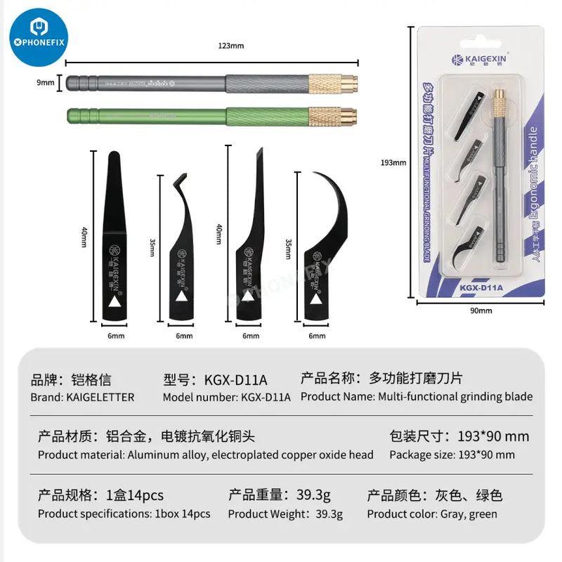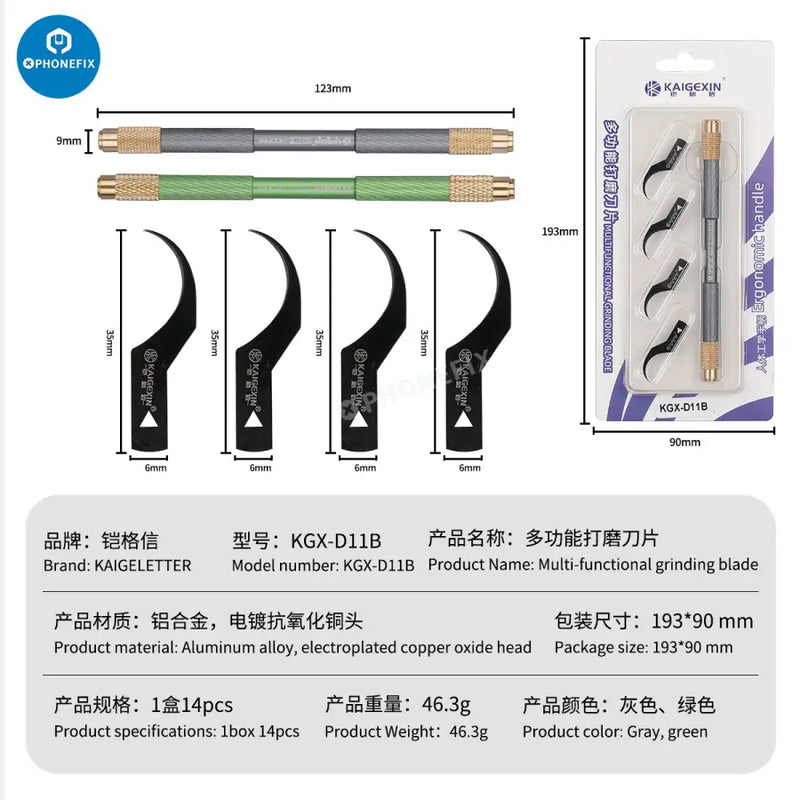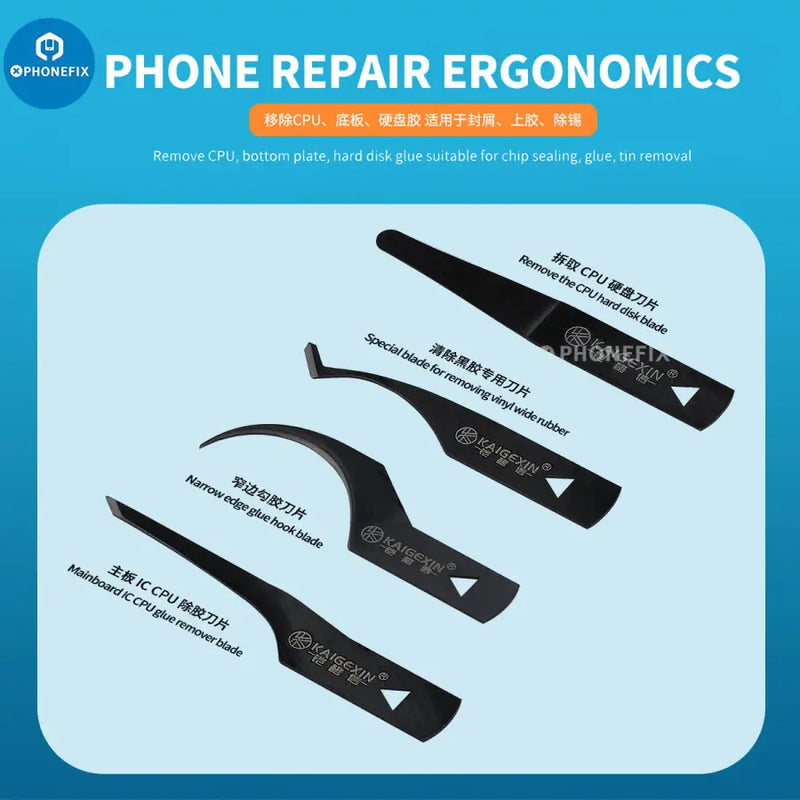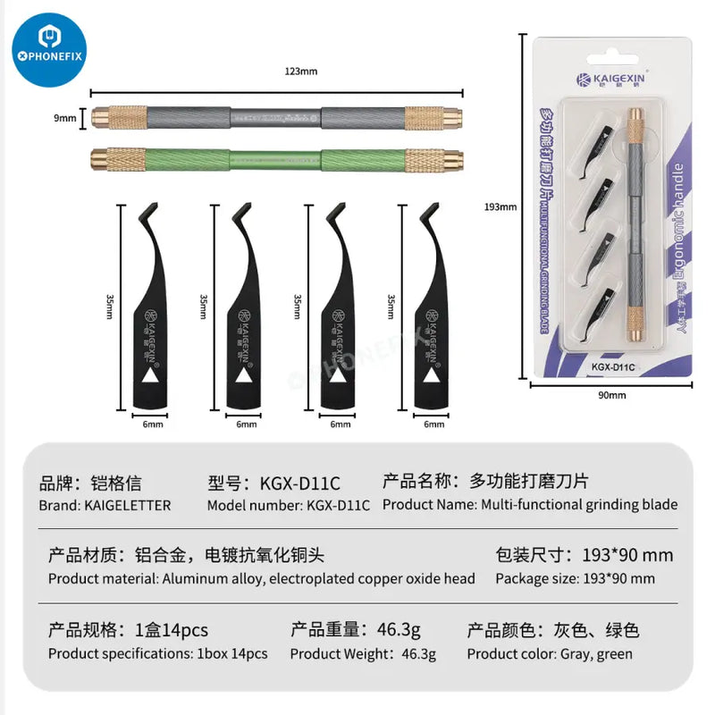 Universal CPU glue removal blade set Nand chip pry scraper for mobile phone, iPad, tablets, electronic BGA board repair. Kaigexin KGX-D11A KGX-D11B KGX-D11C multi-function grinding blade 4 in 1 knife set for BGA CPU NAND chip prying and disassembly, glue cleaning and removing.
