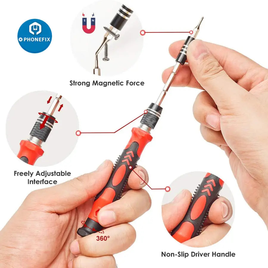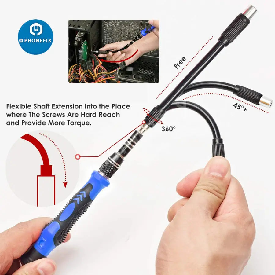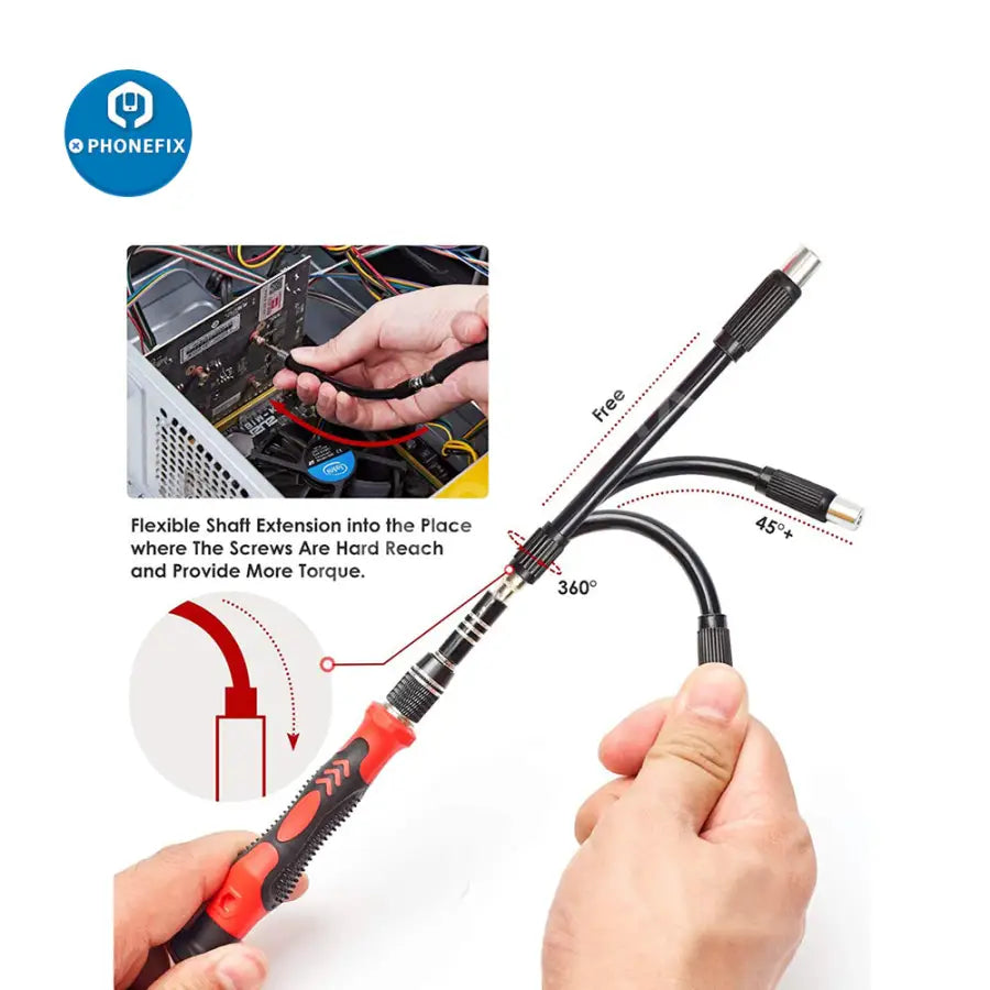 HUMANIZED DESIGN: Ergonomic and no-skid design handle, it is comfortable to hold even for the long-time use. Interchangeable computer repair tool kit is equipped with a hard extension shaft and a flexible extension shaft which is easy to be extended to a narrow place where the handle cannot enter