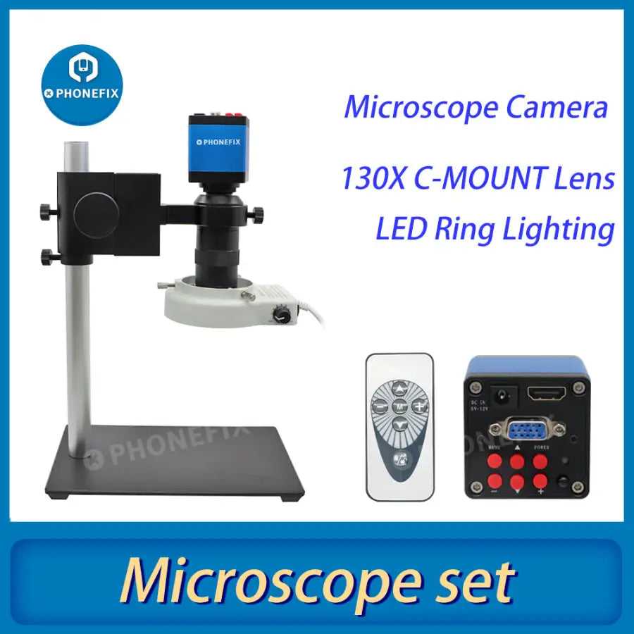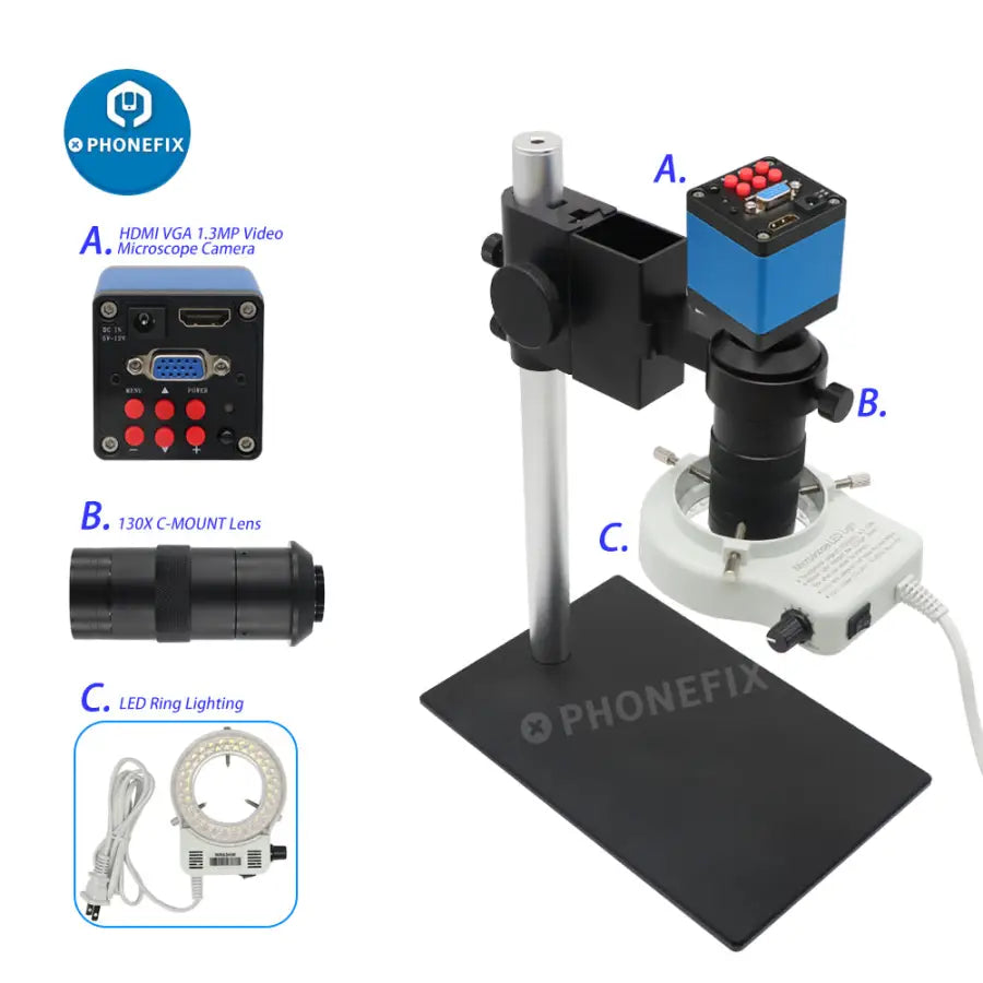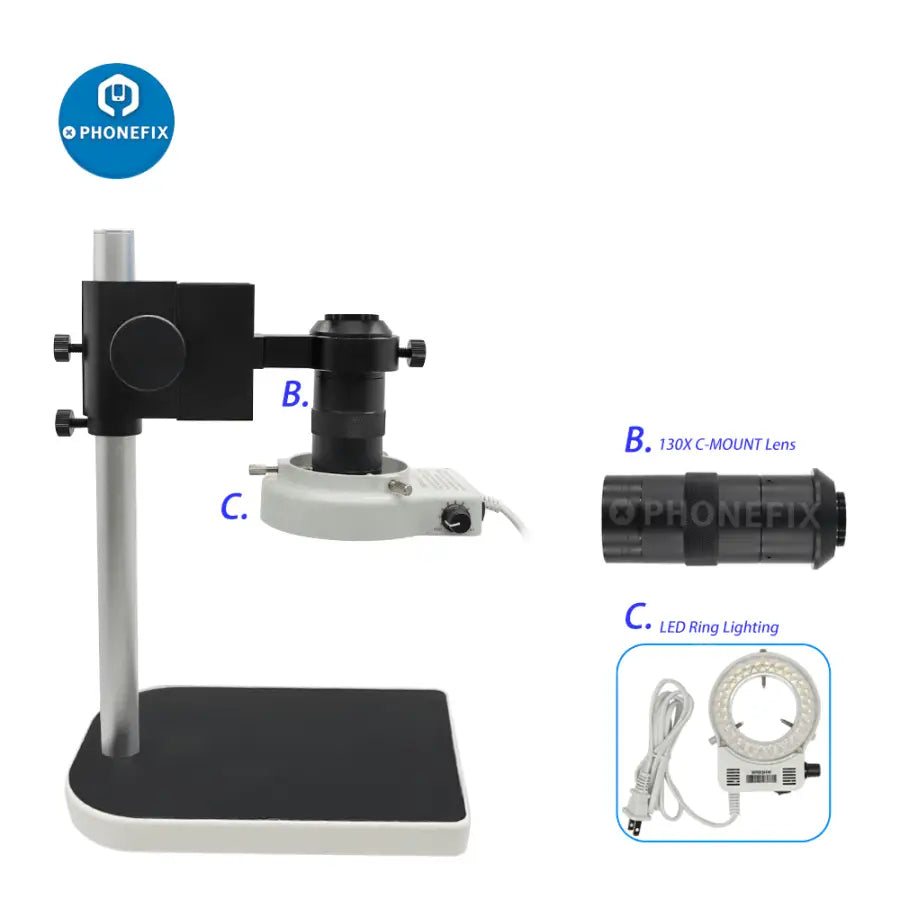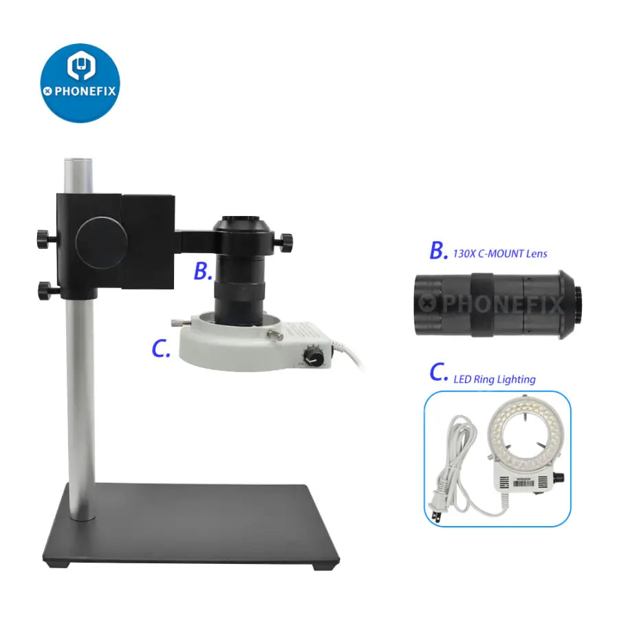 Industrial Digital Microscope Camera Set: 13MP 1/3" 60F/S HDMI VGA Two Output Industrial Camera, 8X~130X C Mount Lens, 40 LEDs Light for Electronic Soldering Repair.