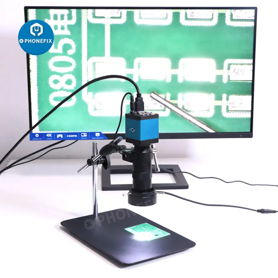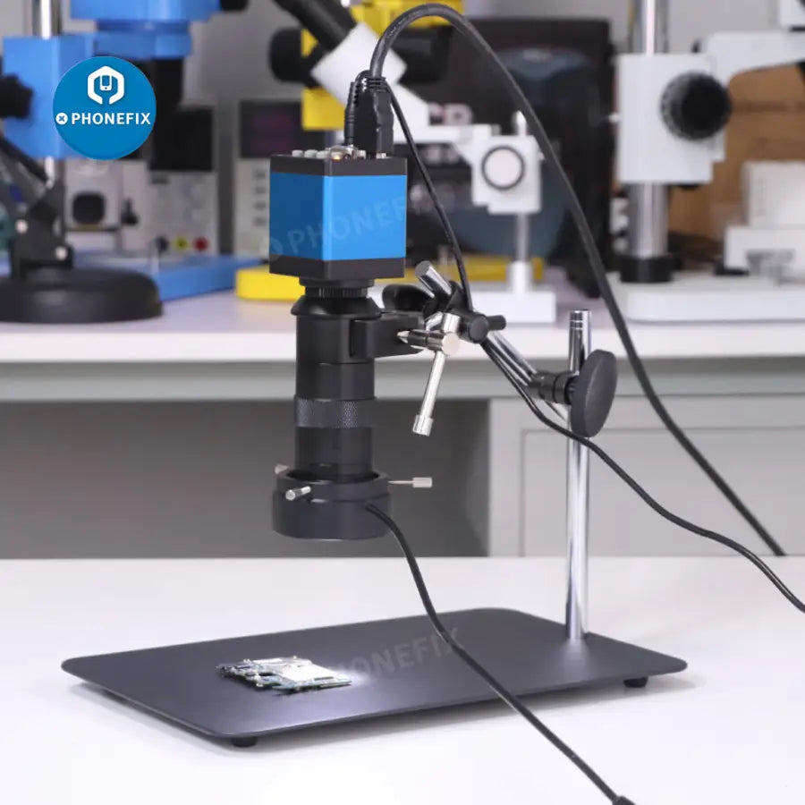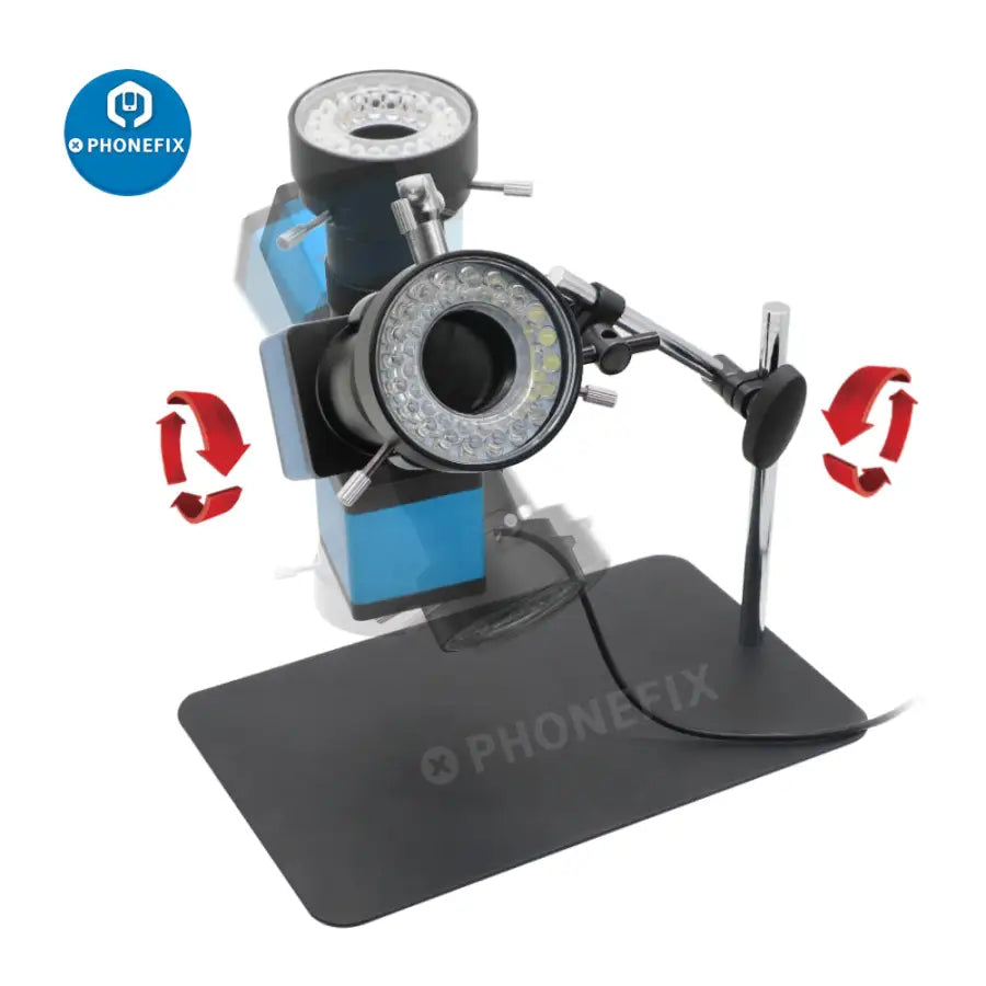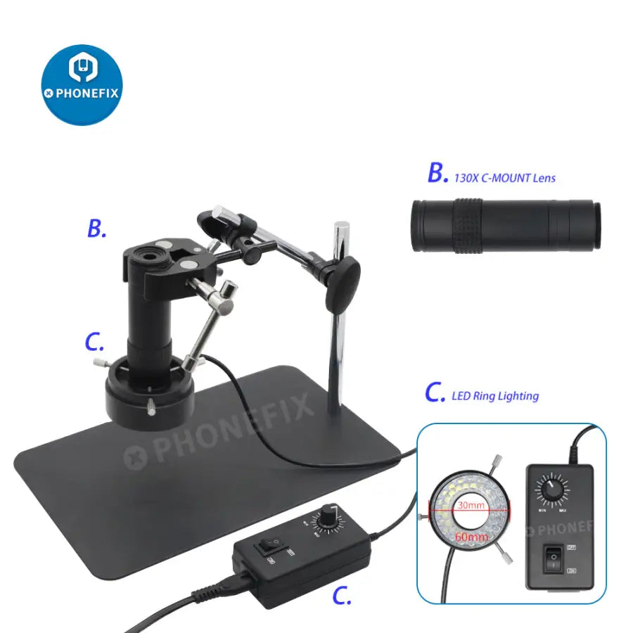 A Industrial Digital Microscope Camera Set: 13MP 1/3" 60F/S HDMI VGA Two Output Industrial Camera + Universal 360° Rotatable Articulating Magic Arm with Adjustable 1/4" Thread Bracket Super Clamp + 1X~130X Zoom C Mount Lens + 40 LEDs Light for Soldering Repair Webcam.