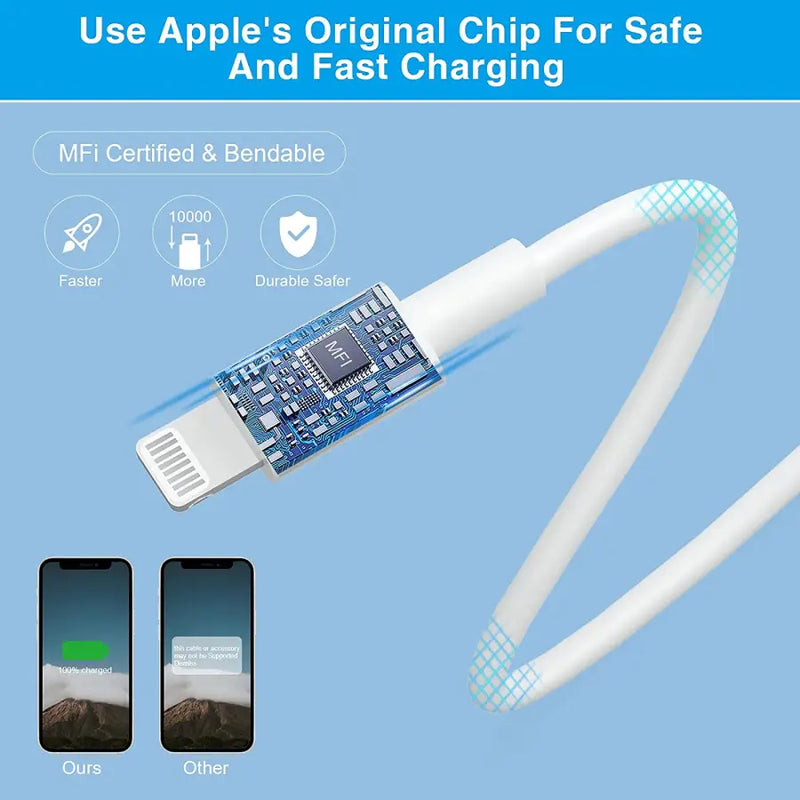 MFI Certified C to Lightning Cable: It made with original Chip can charging in any iOS versions and support 480Mbps data syncing transfer between laptop and iphone in seconds. Comprehensive Design: Compact design make it won’t jam the other ports on the wall outlet and built-in safeguards to protect against overcharging, overheating, short circuiting.
