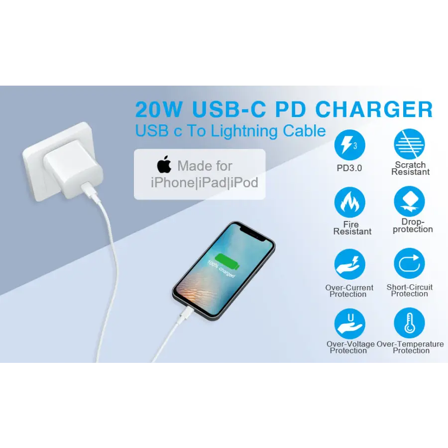 Features : Convenience: Carry one USB C charger to meet all your iPad or iPhone charging need, make travel more simple. Fast Charging: 20W USB-C PD Port, charger iPhone 13 from 0% to 50% in 30mins. High Speed Sync: 480Mbps data syncing transfer, transfer videos, music and more between MacBook and iphone in seconds. Safety Use: Built in smart chip safeguards to protect your laptop or cellphone from over load voltage / current and high-temperature. USB C to Lightning Cable: Included a Apple MFi certified 4ft / 1.2m USB C to Lightning cable let you can work and charge your device anywhere.