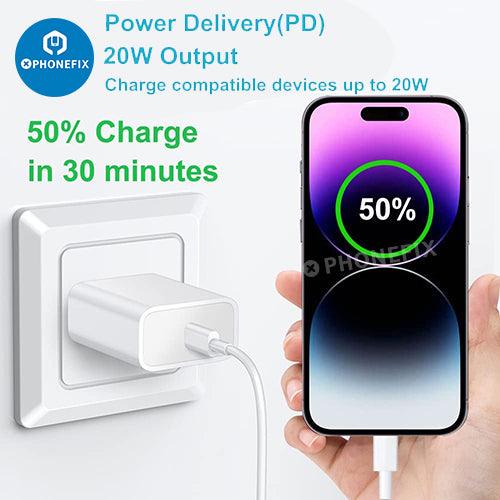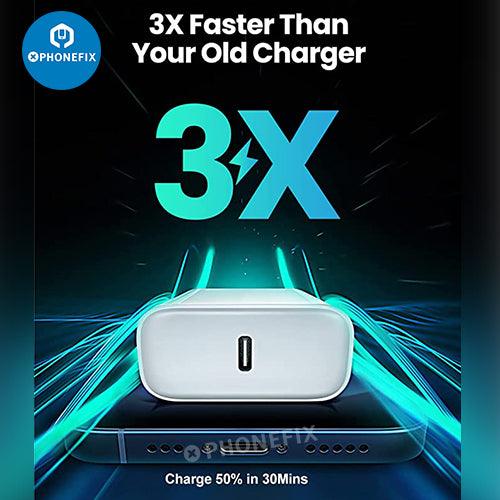 20W Super-Fast Type-C fast wall charger For iPhone iPad Airpods Apple Watch series. This charger charges your iPhone 6-11/12/13/14/15 promax from 0% to 60% within only 30 minutes which is three times faster than an 5W charger.