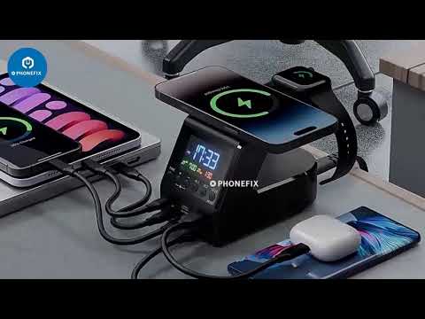 9-in-1 Multi Port Alarm Clock Desktop Charging Station 240W Power Digital Display Wireless Charging Station. Multifunctional Desktop Charging Station combines an alarm clock, wireless phone charging, wireless watch charging, and a convenient night light, creating an efficient and tidy desktop environment. The brightness can be adjusted to individual needs, ensuring comfortable sleep without glare.