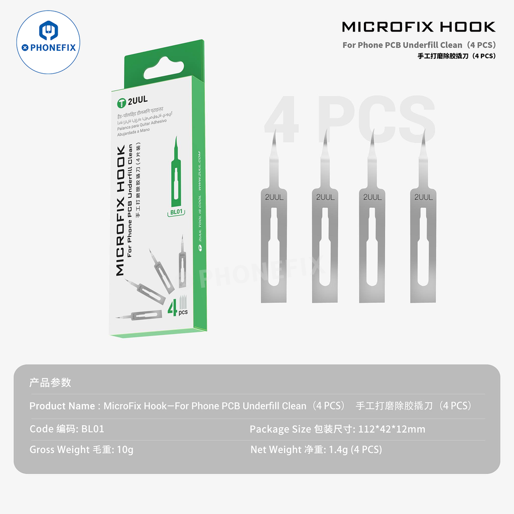 2UUL DA12 MicroFix Hook Phone PCB Clean 3 Blades CPU Chip Underfill Pry Knife with Ultralight Carbon Fiber Handle. 2UUL BL01 MicroFix Hook Blades 4pcs/Set. 2UUL hand made polishing glue removal pry blade for disassembling mobile phone/electronic small chips components and scraping IC glue, etc.