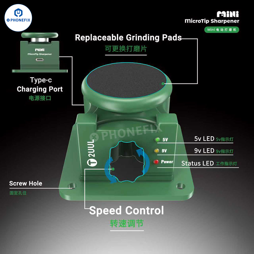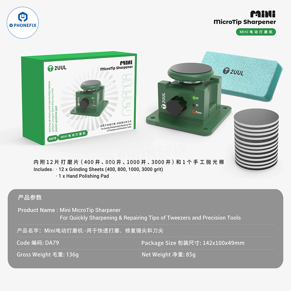 2UUL DA79 Mini Micro Tip Sharpener Electric Polisher Grinder for Grinding Tweezers/Blades Tips. It can quickly sharpen and repair the tips of tweezers and knives. Restoring the sharpness and precision of tweezers and blades to improve mobile phone repair efficiency. Suitable for repairing ordinary tweezers, knives and other precision tools, allowing users to easily perform DIY repairs.