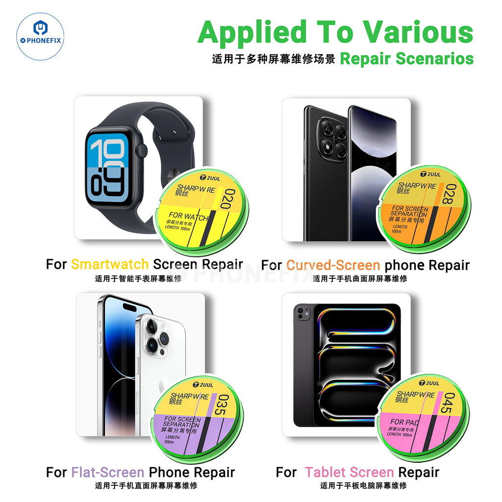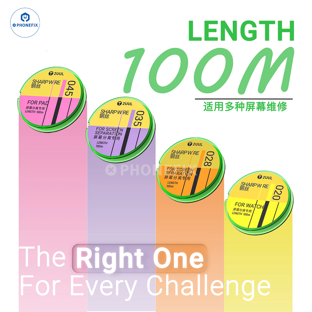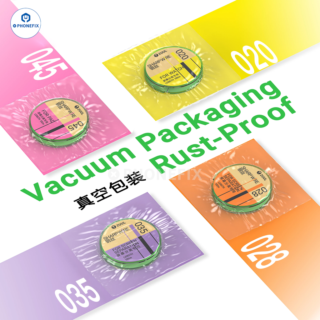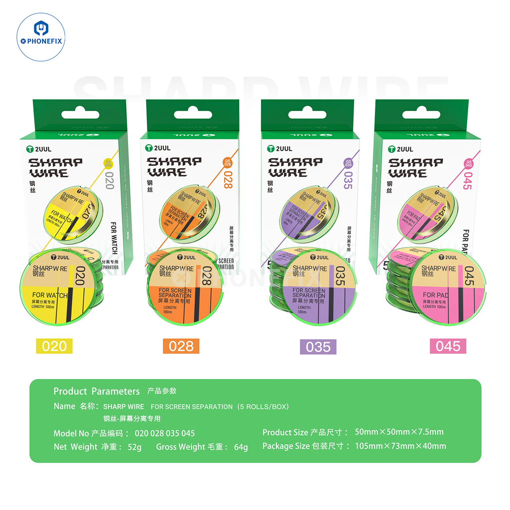 2UUL GS020 GS028 GS035 GS045 Sharp Wire for Screen Separation. 2UUL 0.02mm 0.028mm, 0.035mm, 0045mm screen separation wire features a strong tensile strength design to ensure smooth screen separation. Vacuum-packed, each box contains 5 rolls of different models of separation wire. Each model provides an optimal repair solution for different screen types, suitable for various screen repair scenarios, including smartwatches, mobile phones, tablets, etc.