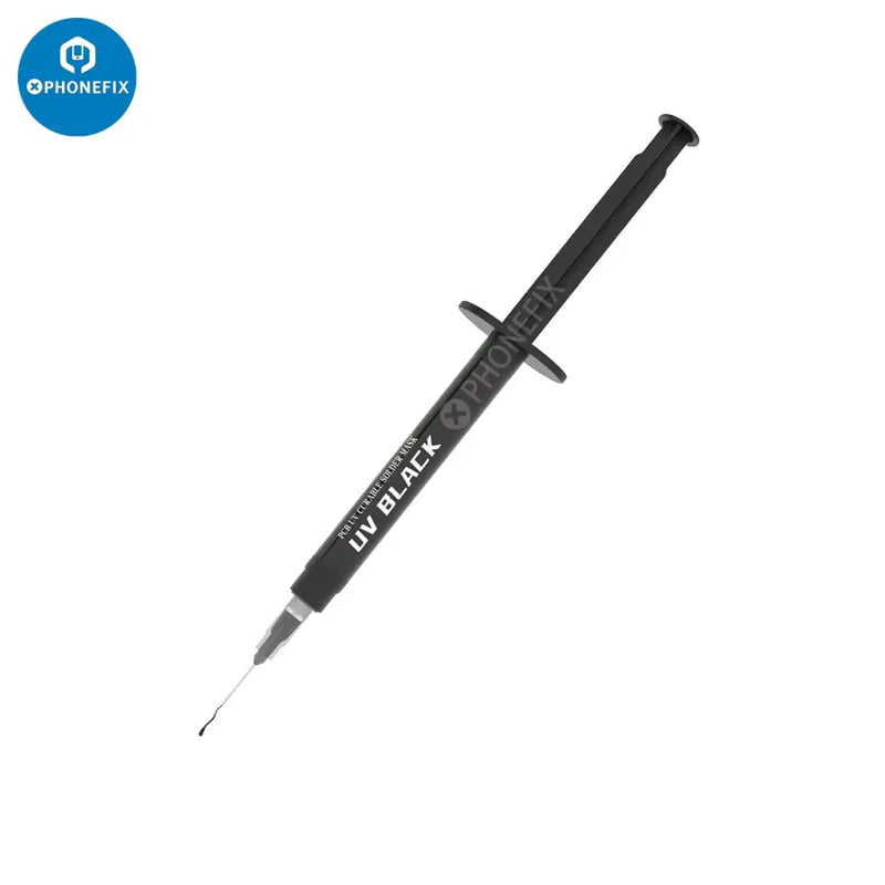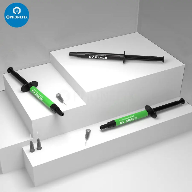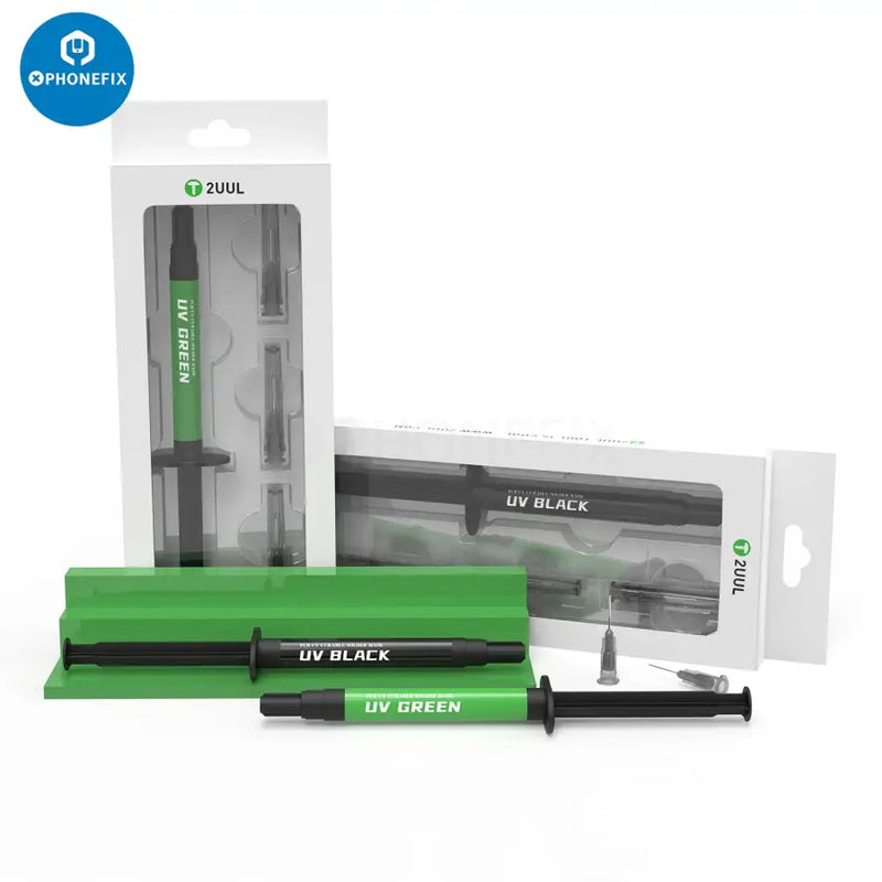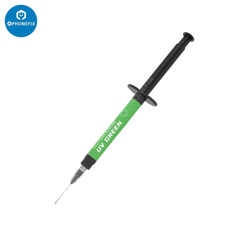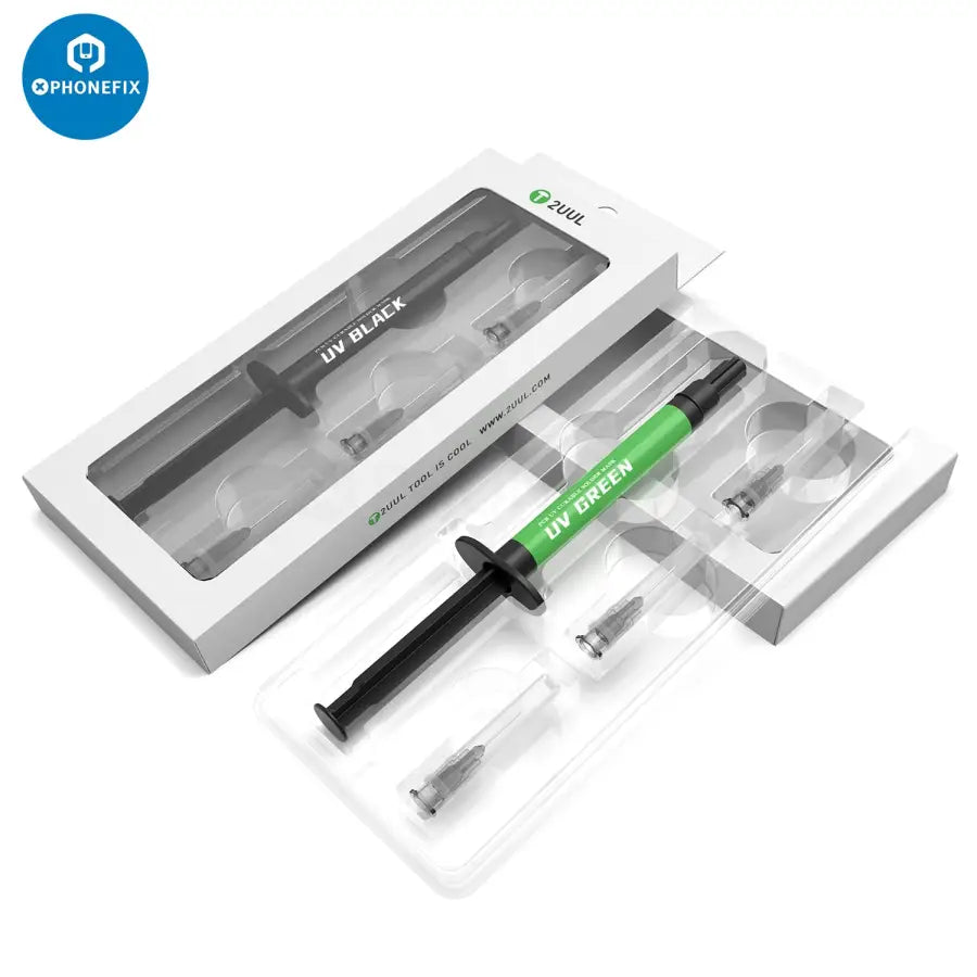 2UUL SC53 UV Green Oil PCB UV Curable Solder Mask for Mobile Phone Motherboard CPU Nand Chip Soldering Repair. 2UUL PCB UV Curable Solder Mask with 3pcs 0.6mm Super Thin Needles, 10ml UV green oil paint. Insulates printed circuit board against shorting and arcing to protect PCB traces from corrosion, and moisture, repairing PCB after soldering and rework.
