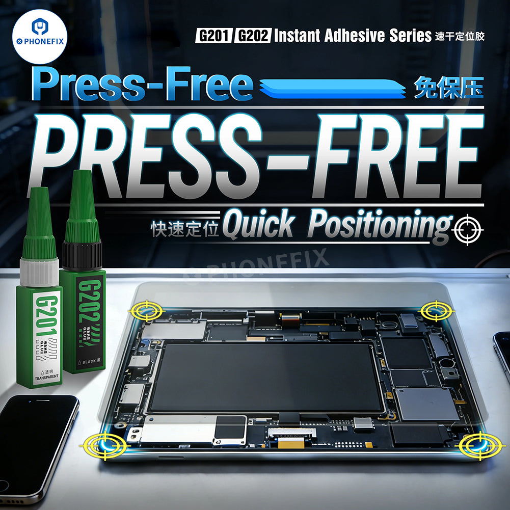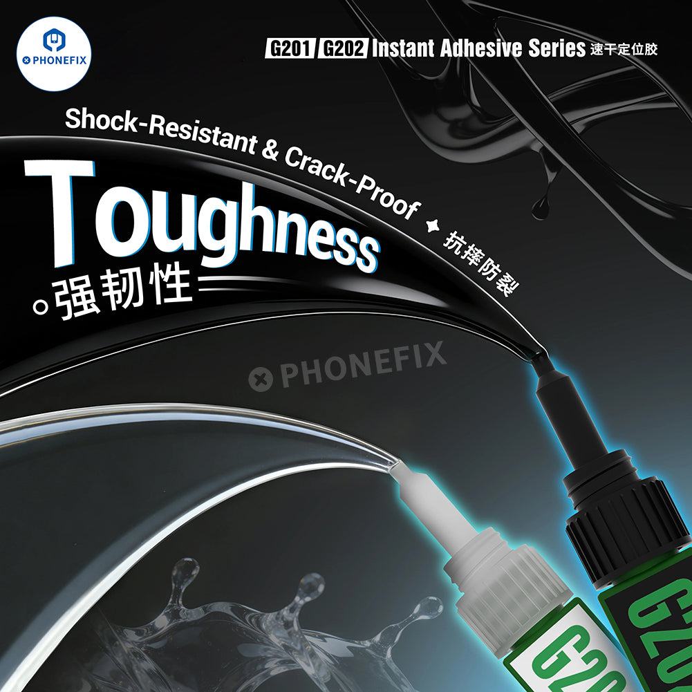 2UUL G201 G202 Instant Adhesive Series Quick-drying Glue for Mobile Phone Screens/Frames Bonding and Components Positioning. Enabling instant curing and ensuring fast and precise bonding. Available in clear and black. G201 transparent glue is suitable for products with high aesthetic requirements, such as mobile phone cases and home appliances; And G202 black glue is suitable for metal bonding in high-humidity environments, such as equipment repair and industrial assembly.