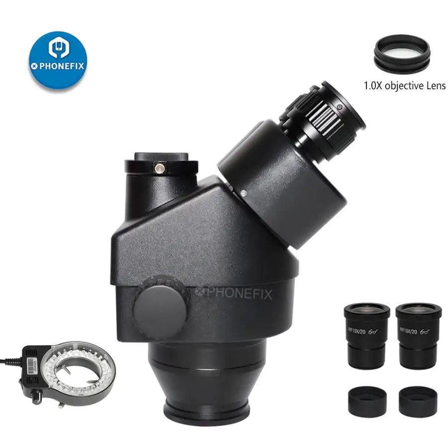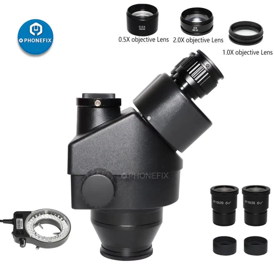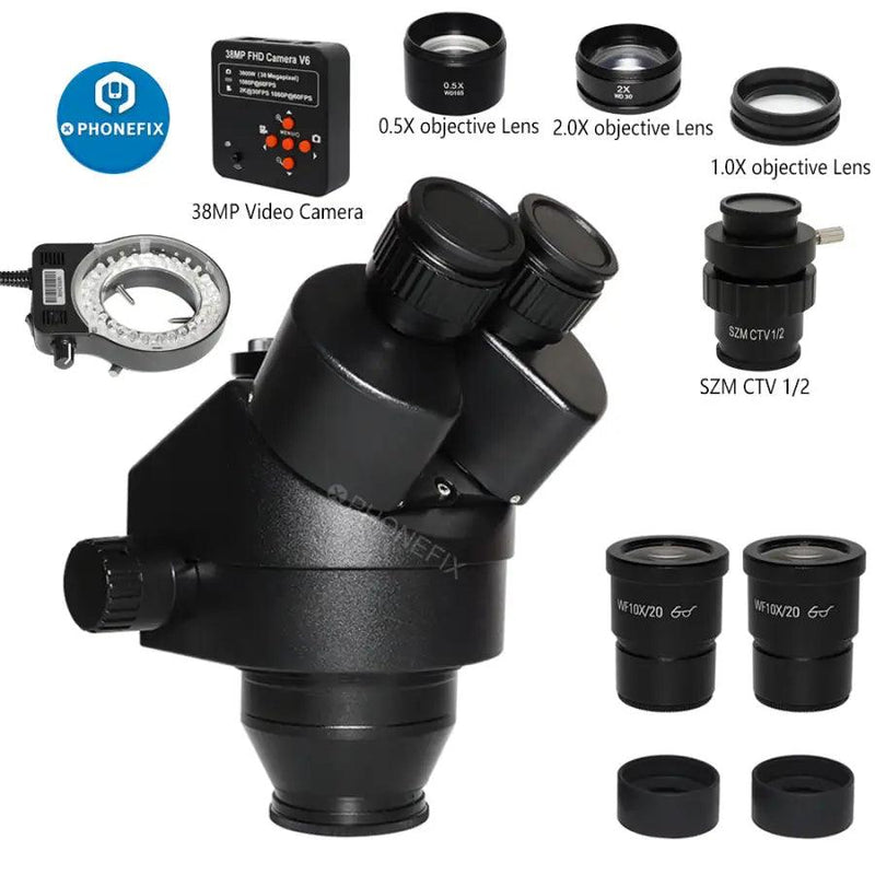 Packing List: 1x Black 7-45X trinocular Stereo Zoom Head. 1x One Pair of Super Widefield 10X Eyepieces. 1x Double-Arm Boom Stand. 1x 144 Led light. 1x Blue mat. 1x 0.5X Barlow Lens (optional). 1x 2.0X Barlow Lens (optional). 1x SZMC TV1/2 or 0.5x C-mount adapter (optional). 1x 38mp camera or VGA camera (optional).