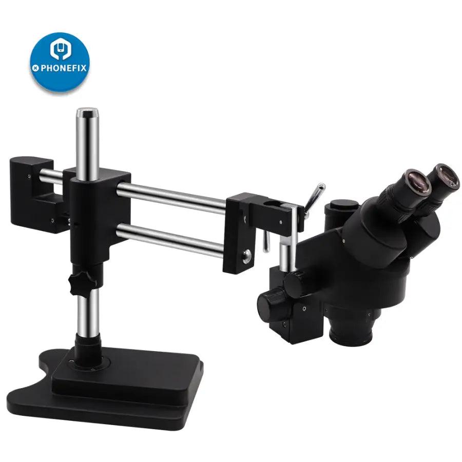 Black 3.5-90X trinocular stereo microscope simultaneously views clear images. Simul-focal trinocular microscope with double-arm boom stand VGA 38MP HDMI camera for PCB BGA CPU IC soldering biological research observation in Mobile Phone repair shop, classroom, home, laboratory, ect. Professional microsoldering device Phone repair tool dual-arms industrial Trinocular Stereo Microscope.