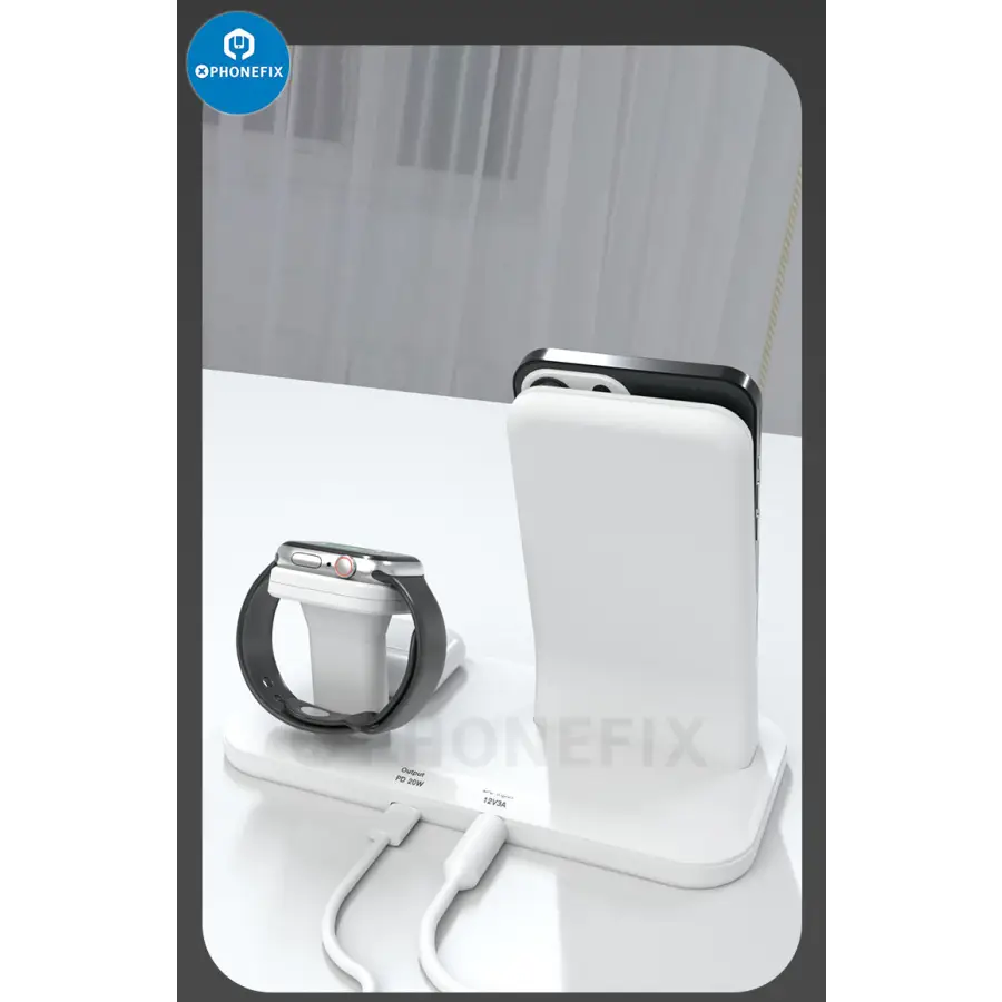 2. 3-in-1 wireless charger(Magnetic coil) for Apple series. Model: TW-299. Power: 36W. Interface: USB-C, POW-DC. Input: DC12V(12V3A power adapter). Phone output: 5W, 7.5W, 10W, 15W. Watch output: 2.5W. Headphone output: 3W. USB-C output: 5V 3A, 9V 2.22A, 12V 1.67A. Adapter: 12V-3A or higher. Sensing distance: 2-5mm Conversion efficiency: ≤72%. Material: PC+ABS fire retardant. Applicable equipment: Apple series: wireless charging iPhone, iWatch, iPods, etc. Product size: 165*80*125mm. Package size: 175*90*130mm.