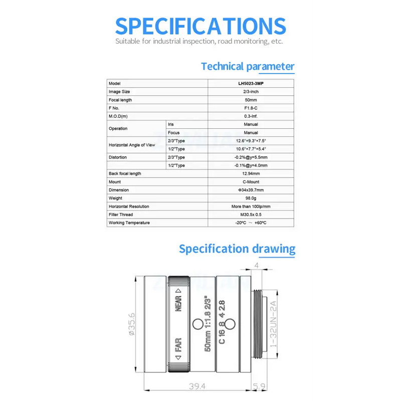 Specification: Model Number:LH5023-3MP Focal Length: 50mm Sensing Area: 2/3" Low Distortion Industrial Lens with Standard FA industrial C Mount Fixed focus, manually adjustable aperture. High contrast, anti-vibration and low distortion. Both ODM and OEM are accepted;
