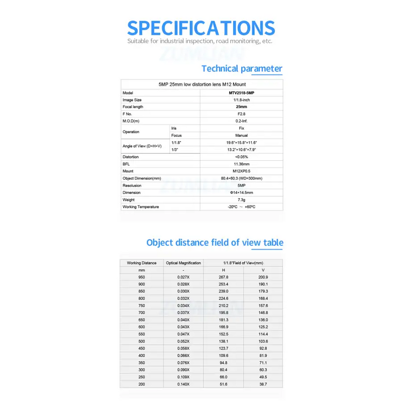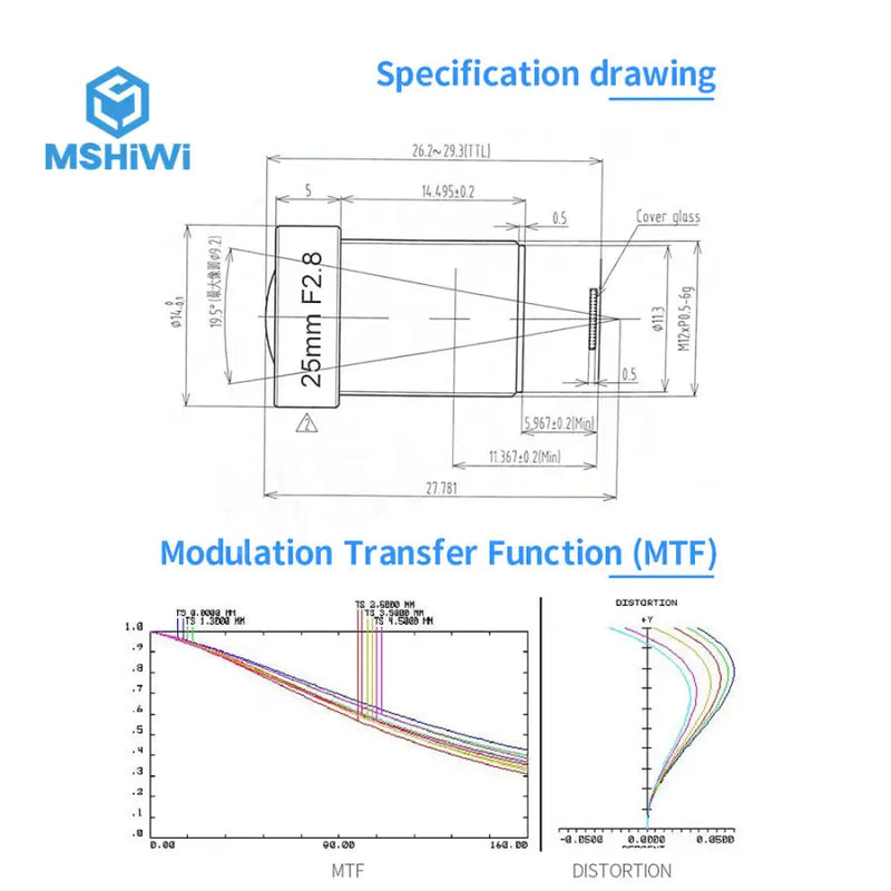 Specification: Model Number:MTV2518-5MP Focal Length:25mm Sensing Area:1/1.8" Low Distortion Industrial Lens with Standard industrial 12/S interface. Standard FA industrial M12/S interface. Fixed focus, manually adjustable aperture. High contrast, anti-vibration and low distortion. Both ODM and OEM are accepted;