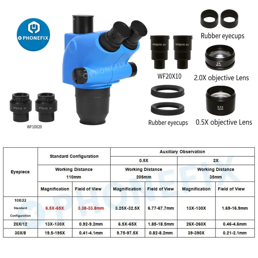 Package Including: 1 x 6.5X-65X Trinocular Stereo Microscope Head 1 x Pair of Super Widefield 10X22MM Eyepieces 1 x Pair of Eye-Guards 1 x Dust Cover (Optional) 1 x 2.0X Microscope Auxiliary Objective Lens(Working Distance 30 mm) 1 x 0.5X Microscope Auxiliary Objective Lens(Working Distance 165 mm)