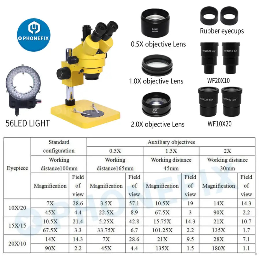 7-45X Package Including: 1X 7-45X Yellow Trinocular Stereo Microscope 1 x A pair Rubber eyecups 1 x A pair WF10X20 Microscope Eyepiece 1X 56-LED Ring Light