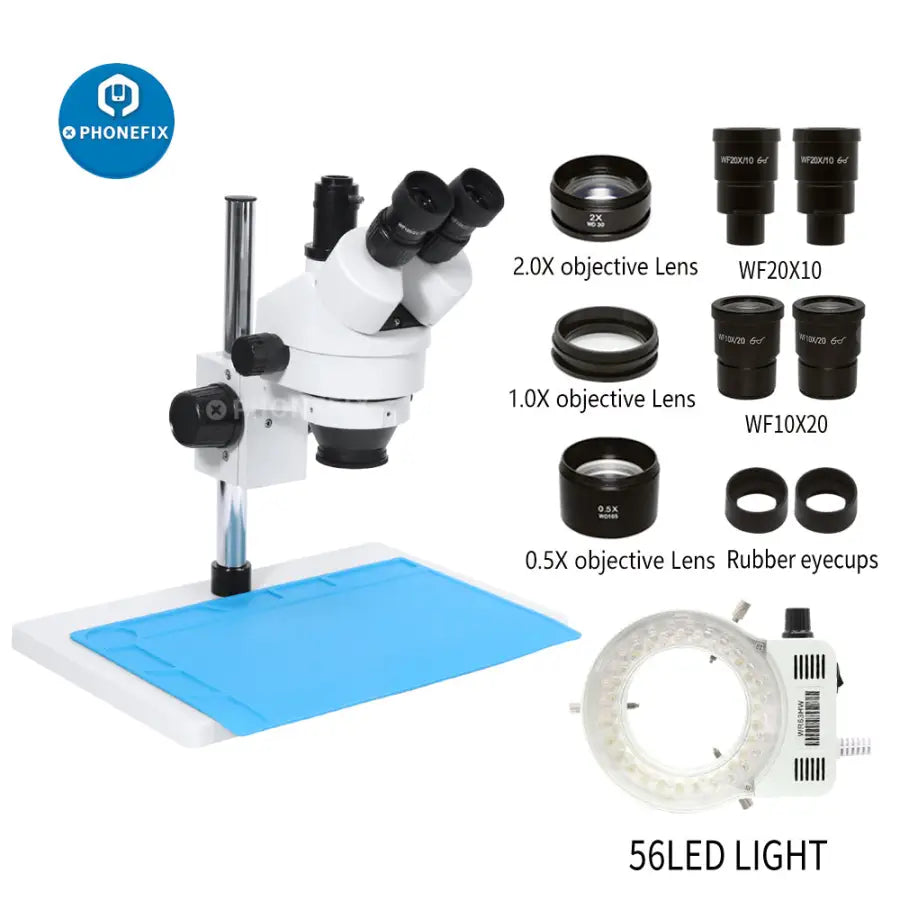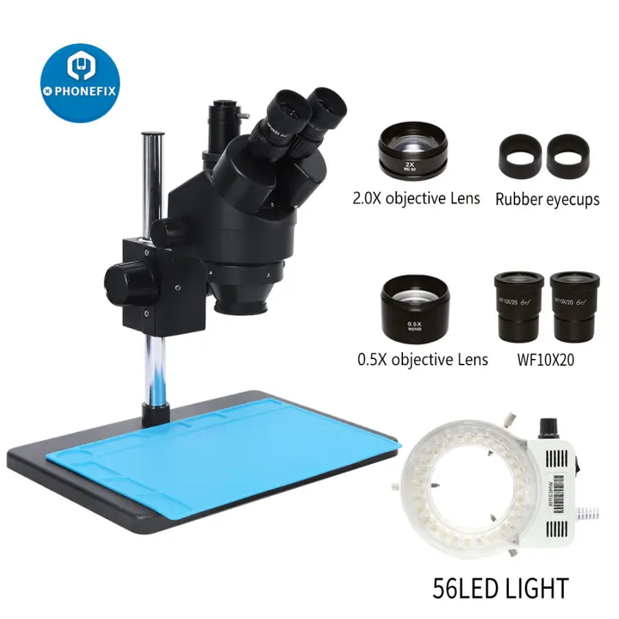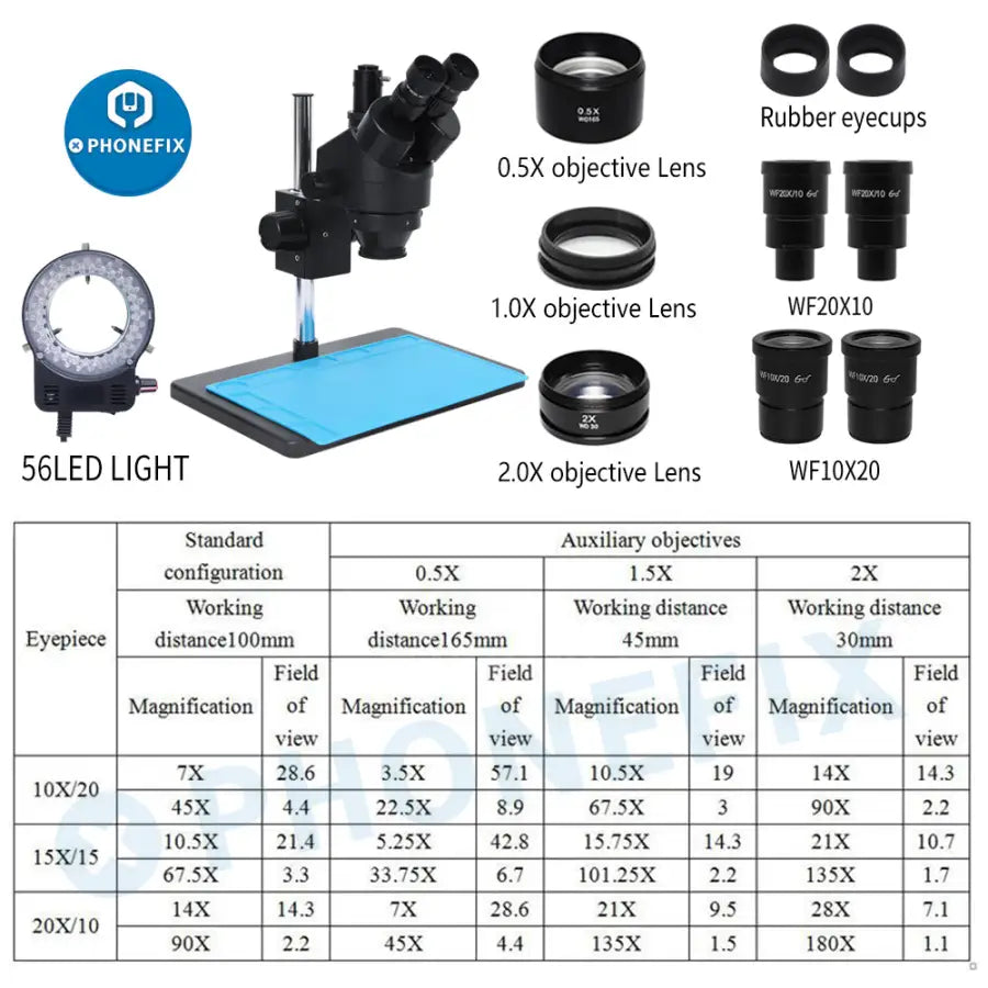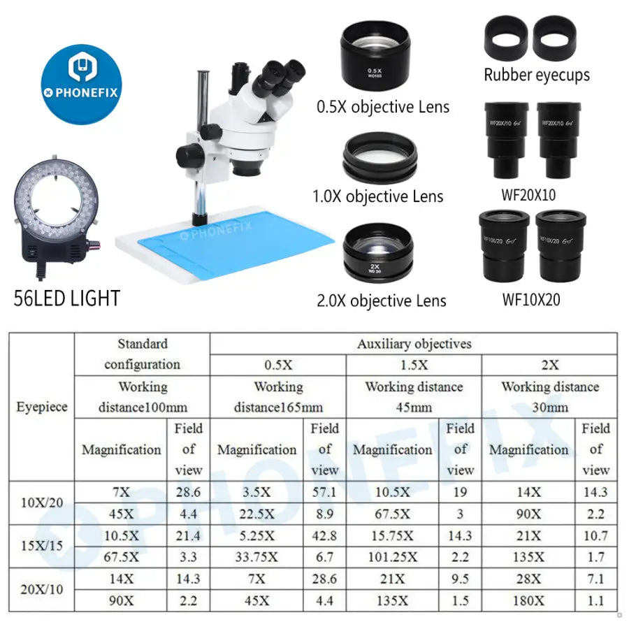 Phone PCB Chip Repair Industrial 7-45X 3.5X-90X Black /White Simul-focal Zoom Trinocular Stereo Microscope With WF10X20mm Eyepieces,7X-45X 3.5X-90X Trinocular Stereo Zoom Big Table Stand Microscope WF20X 0.5X 2.0X Auxiliary Objective Lens