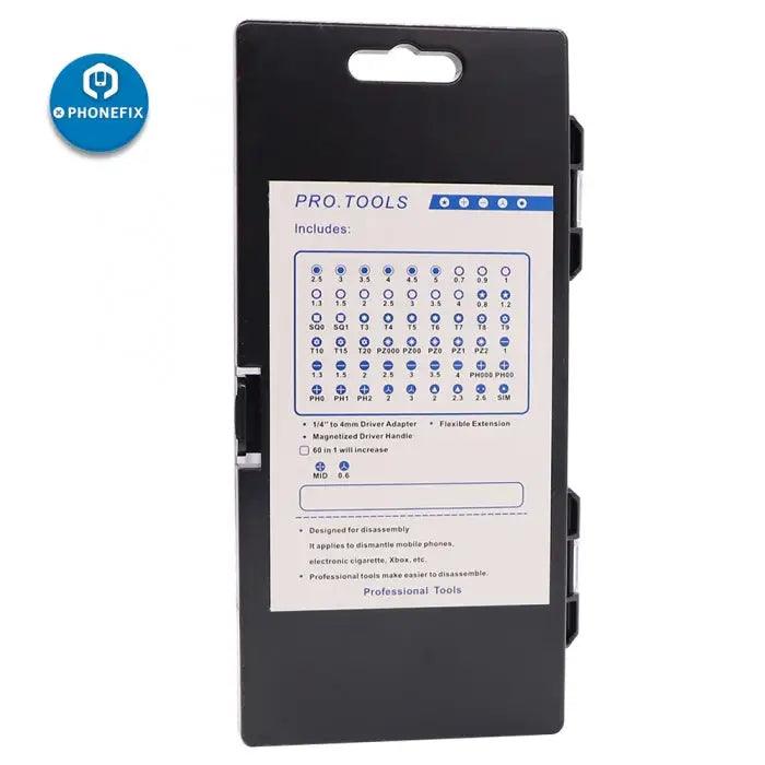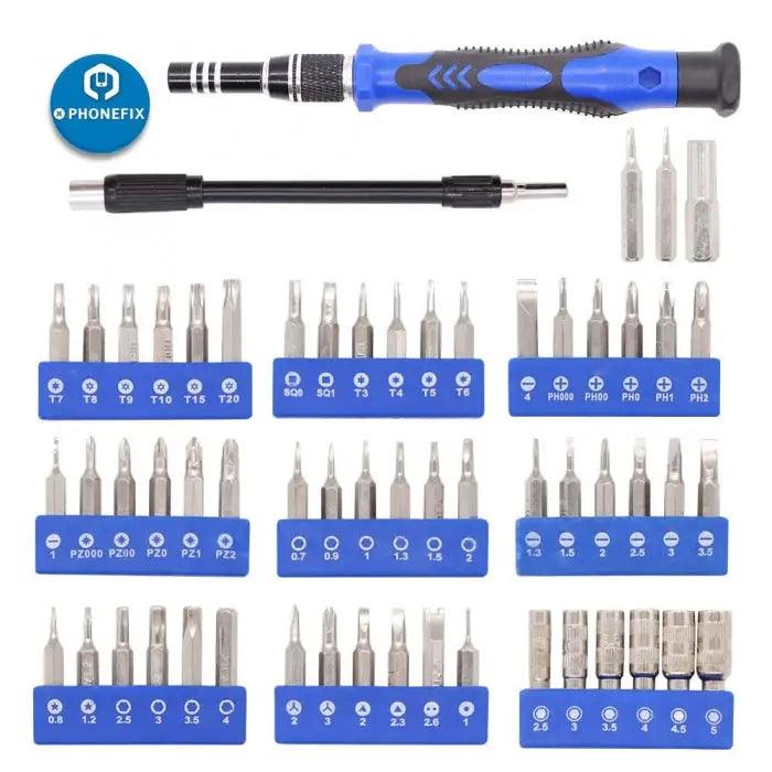 80 in 1 disassembly Kit Repair Tool Kit: 80 in 1 Precision Screwdriver Set includes 56 precision magnetic bits, magnetized driver handle, anti-static wrist strap, ESD anti-static tweezers, triangle-shaped pry bar, steel spudger lever tool and LCD suction cup, triangle slice, cleaning cloth, steel ruler, magnetizing tool, which can repair many electronic devices and other tools.