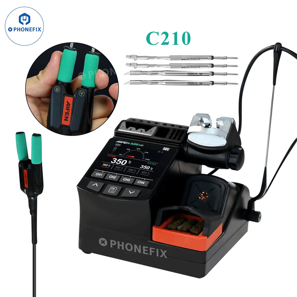 AIFEN A99 HD 320W Soldering Station compatible with C210 C245 iron tips electric tweezers handle and T210 T245 handles for mobile phone repair. AIFEN A99-HD digital display soldering station supports dual-channel detection, precise temperature control, and four sets of temperature memory, suitable for mobile phone/electronic PCB BGA chips welding and repair.