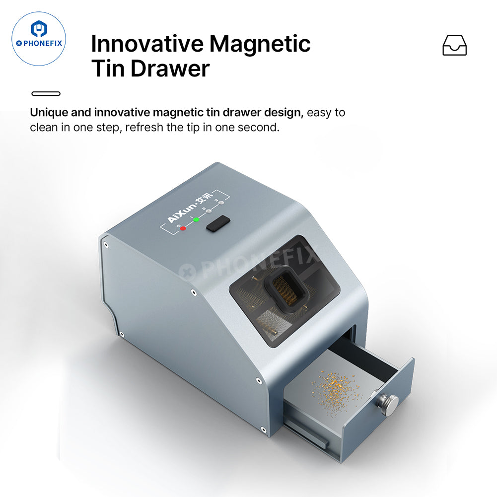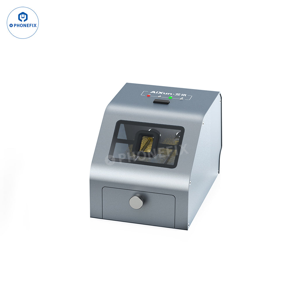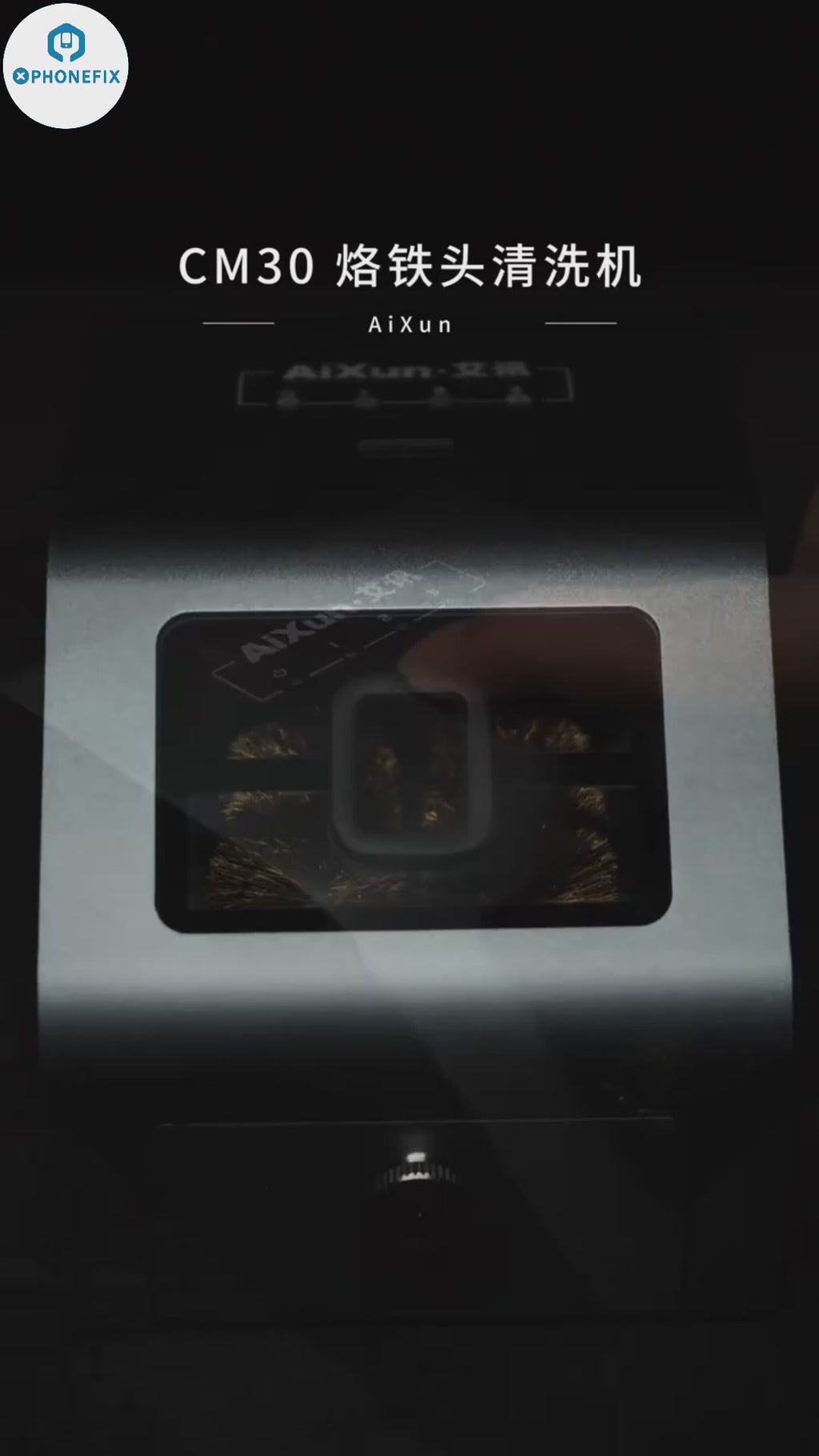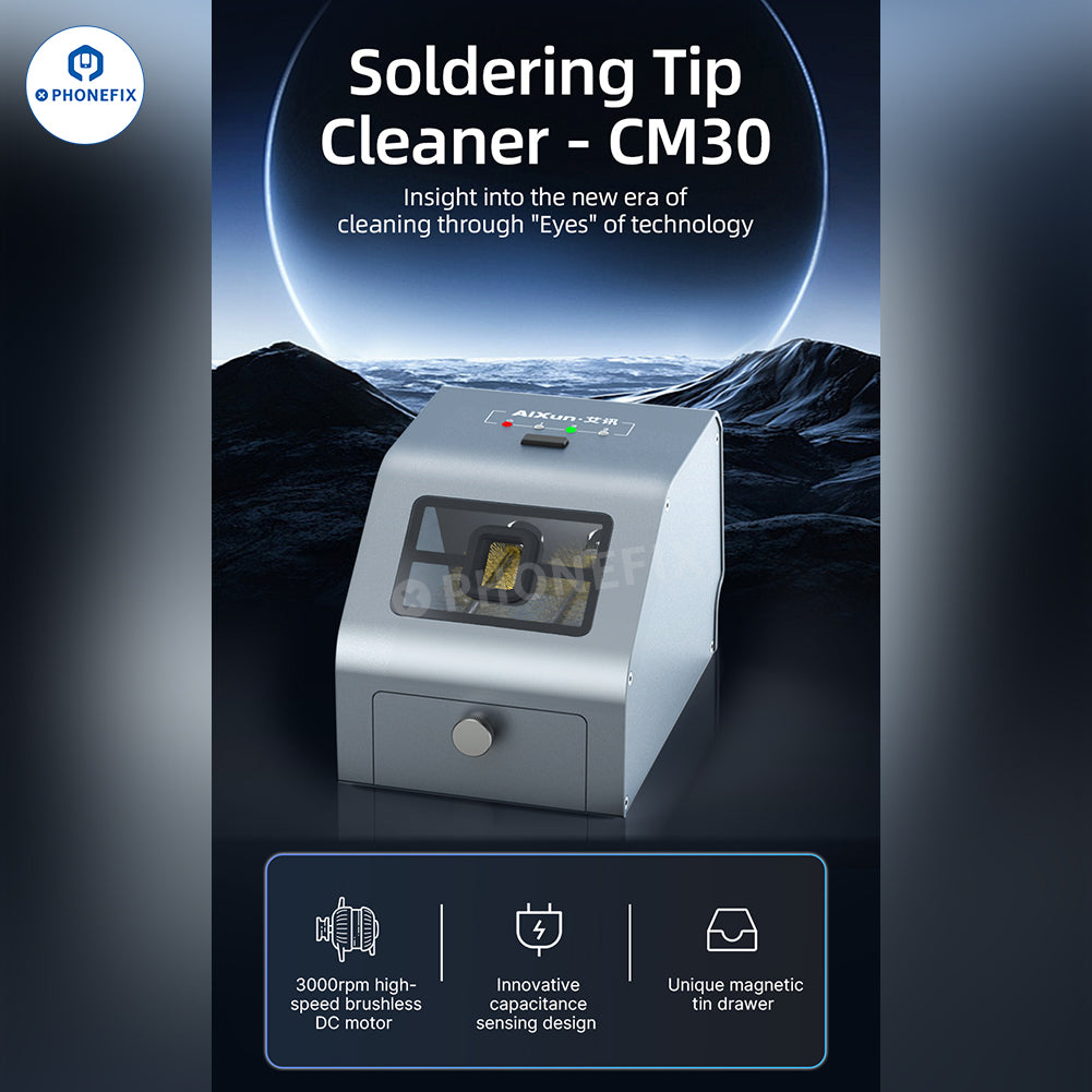 AiXun CM30 Soldering Tip Cleaner with Copper Brush 360-degree high-speed cleaning C210 C115 C245 T12 936 soldering iron tip. AiXun CM30 cartridge tips 3000rpm brushless DC motor automatic detinning cleaning machine, equipped with a unique magnetic tin drawer. Three adjustable settings, visual window showing each cleaning step.