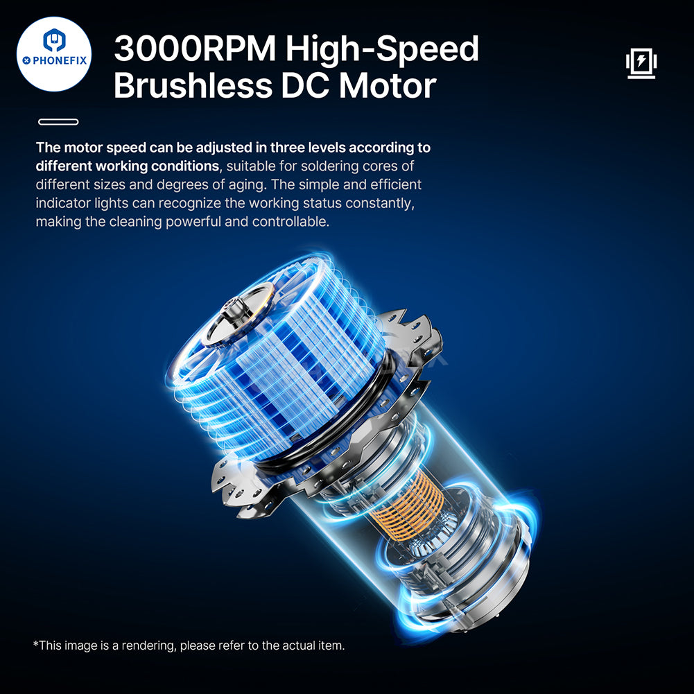 2. 3000RPM high-speed brushless DC motor. The motor speed can be adjusted in three levels according to different working conditions, suitable for soldering cores of different sizes and different degrees of aging. Simple and efficient indicator lights to identify the working status at all times, making cleaning powerful and controllable.