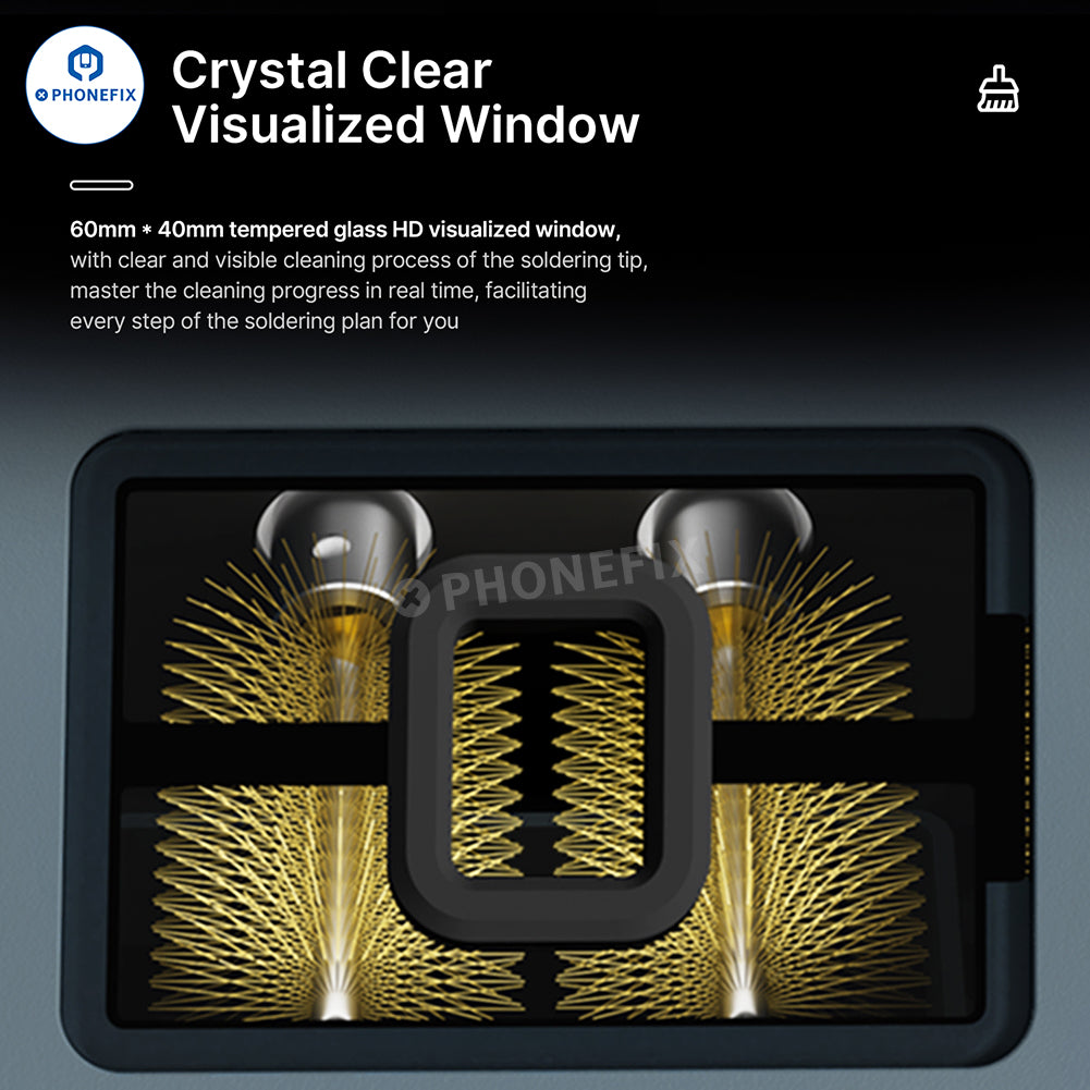 3. 60mm* 40mm tempered glass HD visualized window, with clear and visible cleaning process of the soldering tip, master the cleaning progress in real time, facilitating every step of the soldering plan for you.