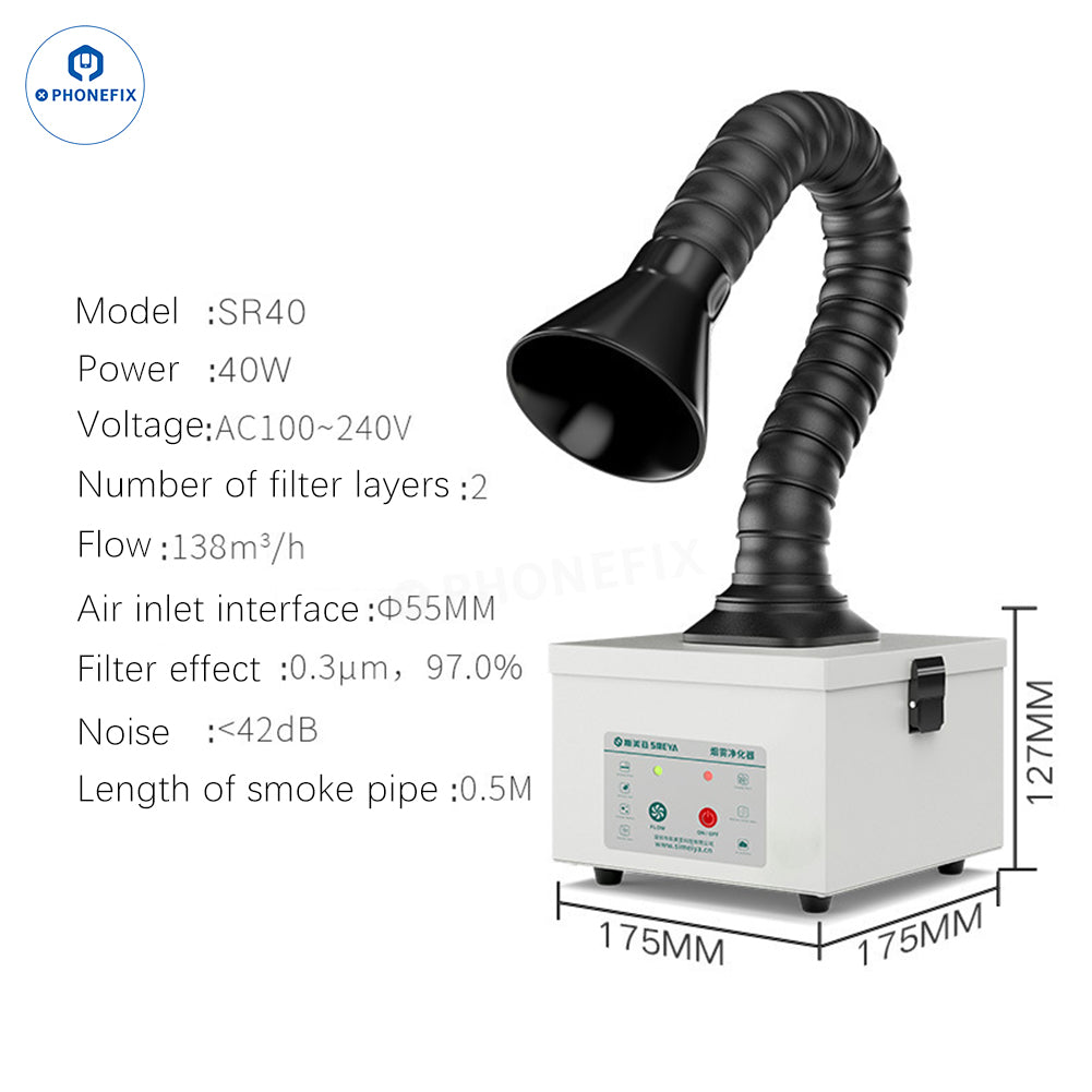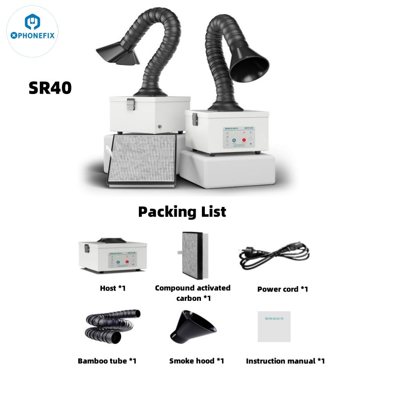 SR40 square smoke hood soldering smoke purifier, imported coconut shell activated carbon, fast adsorption, filtering effect up to 99.97%, suitable for mobile phone repair welding studio, industry, laboratory use, effective adsorption of smoke and harmful gases.